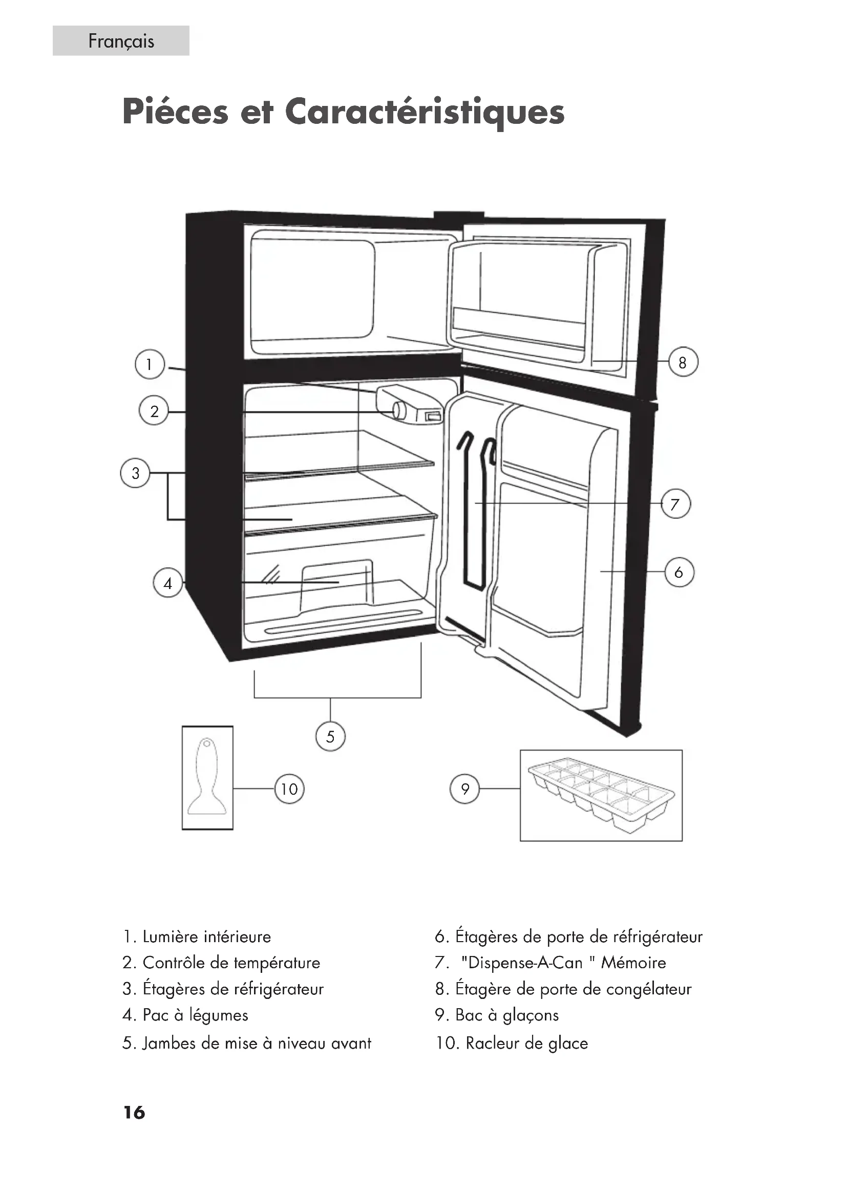 - Pour votre convenance, votre congélateur est équipé d’un grattoir. Maintenance Risque d'incendie ou d'explosion. Réfrigérant inflammable utilisé. Ne perforez pas la tuyauterie réfrigérante. Pour être réparé seulement par le personnel autorisé qualifié de service. Consultez le manuel de réparation avant d'essayer d'entretenir ce produit. Toutes les mesures de sécurité doivent être suivies. Des éléments seront remplacés par les composants similaires pour réduire au minimum le risque d'allumage possible dû aux pièces incorrectes ou au service inexact.21 Français Aliments frais