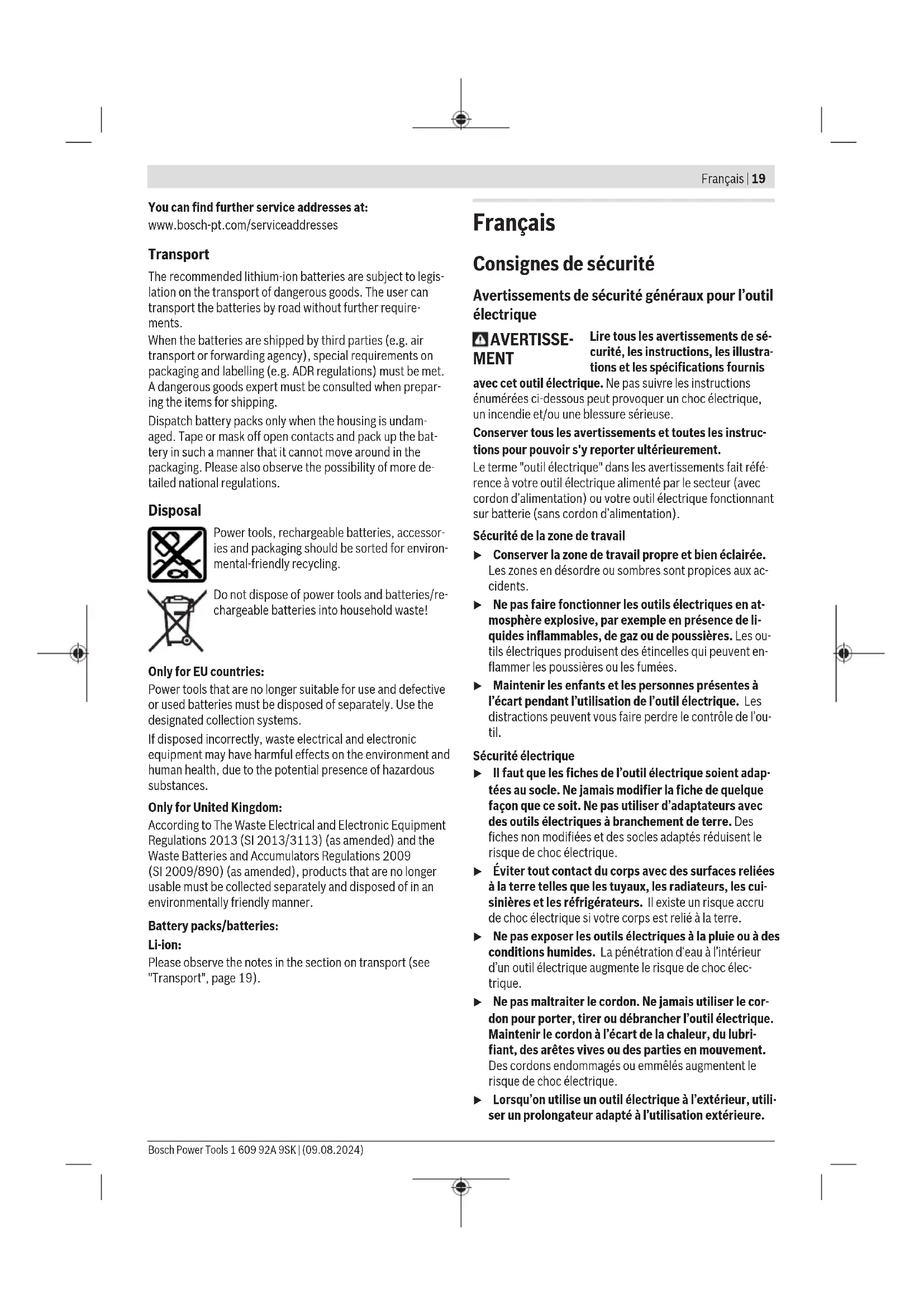 The vibration level and noise emission value given in these instructions have been measured in accordance with a standardised measuring procedure and may be used to com- pare power tools. They may also be used for a preliminary estimation of vibration and noise emissions. The stated vibration level and noise emission value repres- ent the main applications of the power tool. However, if the power tool is used for other applications, with different ac- cessories or is poorly maintained, the vibration level and noise emission value may differ. This may significantly in- crease the vibration and noise emissions over the total work- ing period. To estimate vibration and noise emissions accurately, the times when the tool is switched off or when it is running but not actually being used should also be taken into account. This may significantly reduce vibration and noise emissions over the total working period. Implement additional safety measures to protect the oper- ator from the effects of vibration, such as servicing the power tool and accessories, keeping their hands warm, and organising workflows correctly. Notes on Accuracy The reduction in speed (especially below 50%) can lower the maximum torque. The increased speed when using Power Boost may affect the accuracy and shut-off beha- viour. The clutch may be released. Machine capability tests are usually done at 600rpm in ac- cordance with VDI2647. Changes to the speed and/or torque may affect the accur- acy. The machine capability must be checked with the relevant setting. Rechargeable battery Bosch sells some cordless power tools without a re- chargeable battery. You can tell whether a rechargeable bat- tery is included with the power tool by looking at the pack- aging. Charging the battery u Use only the chargers listed in the technical data. Only these chargers are matched to the lithium-ion battery of your power tool. Note: Lithium-ion rechargeable batteries are supplied par- tially charged according to international transport regula- tions. To ensure full rechargeable battery capacity, fully charge the rechargeable battery before using your tool for the first time. 1 609 92A 9SK | (09.08.2024) Bosch Power ToolsEnglish | 17 Inserting the Battery Push the charged battery into the battery holder until it clicks into place. Removing the Battery To remove the rechargeable battery, press the battery re- lease buttons and pull the battery out. Do not use force to do this. Battery charge indicator (yellow LED) Battery charge indicator(4) Meaning Flashing light + sound Charge the battery: You can only drive in 6 to 8 more screws. Continuous light + sound There is not enough capacity left to drive in another screw or the power tool has over- loaded: The power tool can no longer be switched on. – Remove the battery and replace it with a battery that is fully charged. Flashing light The power tool has overheated and switched itself off: – Wait a short while for the light to stop flashing before switching the power tool on again. When the rechargeable battery(7) is inserted and the on/off switch(8) is pressed, the battery charge indicator(4) dis- plays the battery's state of charge for 5seconds. Rechargeable battery charge indicator(4) Capacity Green 60–100% Yellow 30–60% Red 0–30% Recommendations for Optimal Handling of the Battery Protect the battery against moisture and water. Only store the battery within a temperature range of −20 to 50°C. Do not leave the battery in your car in the summer, for example. A significantly reduced operating time after charging indic- ates that the battery has deteriorated and must be replaced. Follow the instructions on correct disposal. Assembly u Before carrying out any work on the power tool (e.g. maintenance, tool change etc.), remove the battery from the power tool. There is risk of injury from uninten- tionally pressing the on/off switch. Operating and storage conditions The power tool is suitable only for operation at enclosed work sites. To ensure smooth operation, the permitted ambient temper- ature should be between 0°C and+45 °C, at a permitted rel- ative humidity of between 20 and 90%, free of condensa- tion. Configuring the power tool You can configure various settings on the power tool (e.g. ro- tational speed, screwing stage, repeat protection) using BOSCH EXACT Configurator software of version 5.2 or higher. The power tool must be connected to a PC via its USB port in order to do this. Use a USB cable for this: USB2.0TypeA/Micro-USB2.0TypeB – Double-shielded – Max. length 1m When configuring via the USB port, radio interference may occur outside the industrial environment. u Observe all safety notes and instructions in the software operating instructions. Changing the tool (see figure A) u When fitting an application tool, make sure that it is held securely in the tool holder. If the application tool is not held securely in the tool holder, it may become loose and consequently uncontrollable. Inserting the Application Tool Only use application tools with the matching shank (1/4" hexagon). – Pull the sleeve of the quick-change chuck forwards. – Place the application tool into the tool holder (10) and re- lease the quick-change chuck again. Removing the application tool – Pull the sleeve of the quick-change chuck forwards. – Take the application tool out of the tool holder(10) and release the quick-change chuck again. Operation Always set the rotational direction using the rotational direc- tion switch (5) before starting the power tool: The power tool will not start if the rotational direction switch (5) is in the centre (lock-off button). Setting the rotational direction (see figure B) – Clockwise: To drive in screws, press the rotational direc- tion switch (5) through as far as possible to the left. – Anti-clockwise: To loosen or unscrew screws, press the rotational direction switch (5) through as far as possible to the right. Bosch Power Tools 1 609 92A 9SK | (0