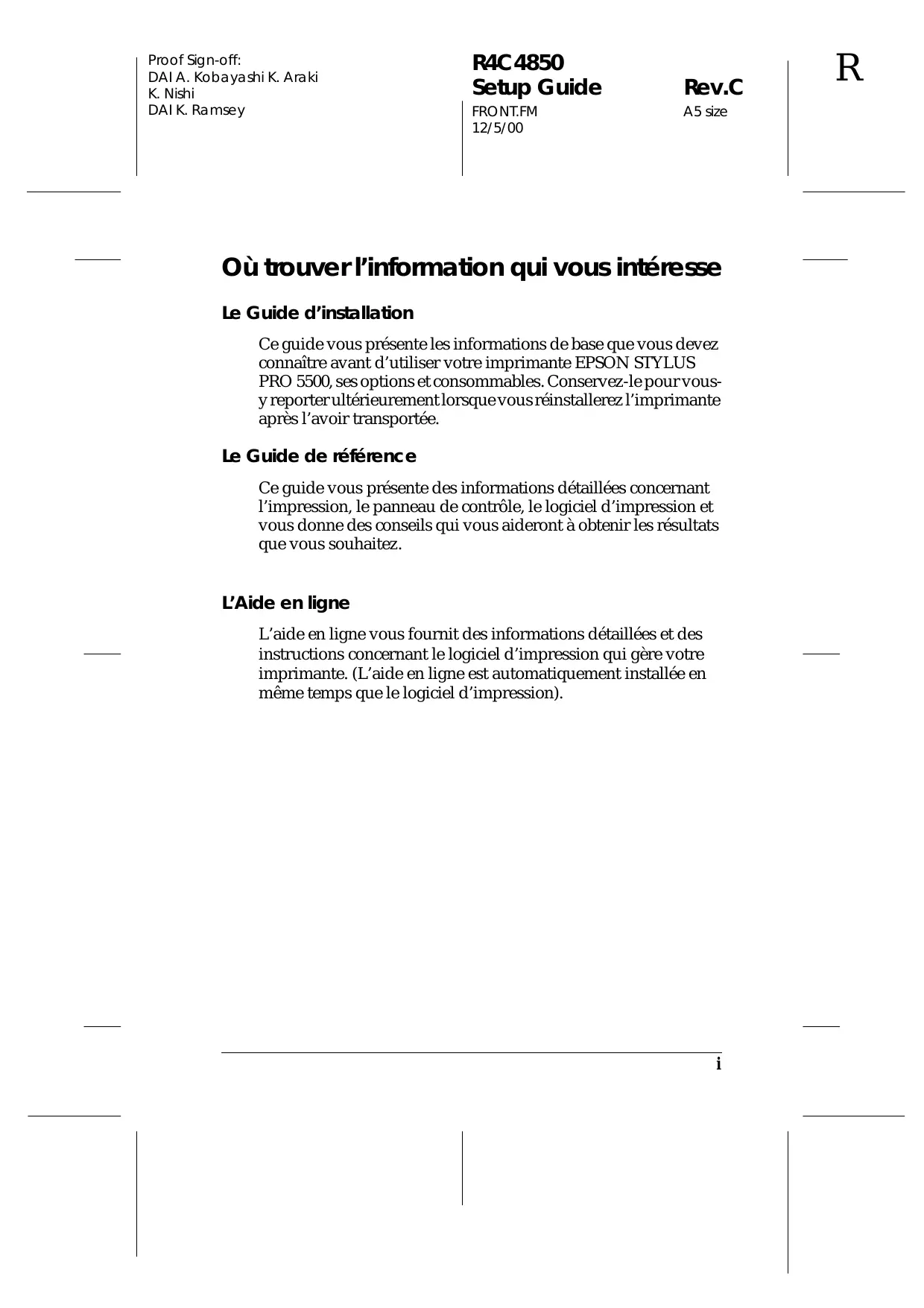 Rev.C A5 size Proof Sign-off: DAI A. Kobayashi K. Araki K. Nishi DAI K. Ramsey Proof Sign-off: DAI A. Kobayashi K. Araki K. Nishi DAI K. Ramsey R4C4850 Setup Guide FRONT.FM 12/5/00 Rev.C A5 size Où trouver l’information qui vous intéresse Le Guide d’installation Ce guide vous présente les informations de base que vous devez connaître avant d’utiliser votre imprimante EPSON STYLUS PRO 5500, ses options et consommables. Conservez-le pour vousy reporter ultérieurement lorsque vous réinstallerez l’imprimante après l’avoir transportée. Le Guide de référence Ce guide vous présente des informations détaillées concernant l’impression, le panneau de contrôle, le logiciel d’impression et vous donne des conseils qui vous aideront à obtenir les résultats que vous souhaitez. L’Aide en ligne L’aide en ligne vous fournit des informations détaillées et des instructions concernant le logiciel d’impression qui gère votre imprimante. (L’aide en ligne est automatiquement installée en même temps que le logiciel d’impression).