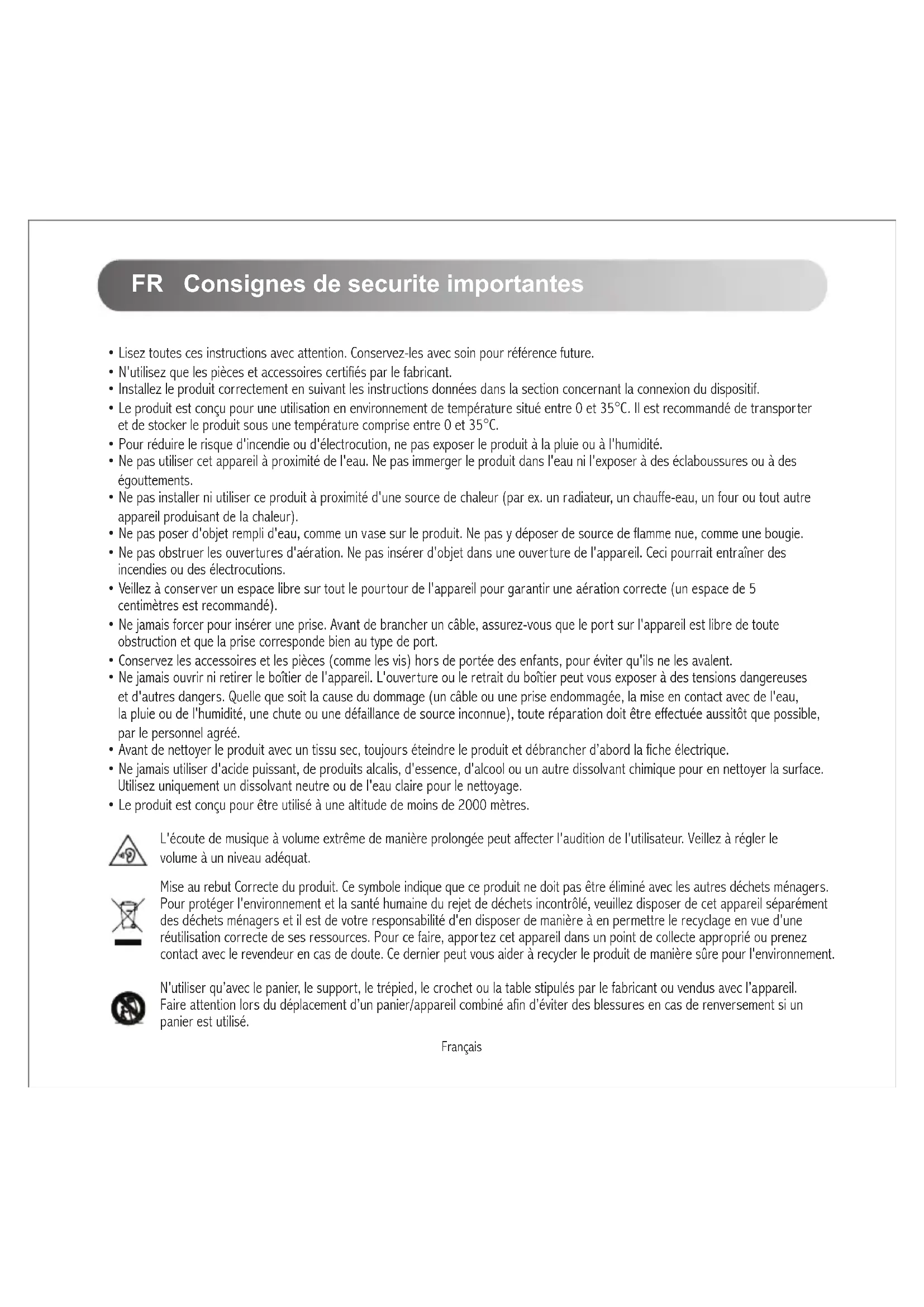 - Le produit est conçu pour être utilisé à une altitude de moins de 2000 mètres. L'écoute de musique à volume extrême de manière prolongée peut affecter l'audition de l'utilisateur. Veillez à régler le volume à un niveau adéquat. Mise au rebut Correcte du produit. Ce symbole indique que ce produit ne doit pas être éliminé avec les autres déchets ménagers. Pour protéger l'environnement et la santé humaine du rejet de déchets incontrôlé, veuillez disposer de cet appareil séparément des déchets ménagers et il est de votre responsabilité d'en disposer de manière à en permettre le recyclage en vue d'une réutilisation correcte de ses ressources. Pour ce faire, apportez cet appareil dans un point de collecte approprié ou prenez contact avec le revendeur en cas de doute. Ce dernier peut vous aider à recycler le produit de manière sûre pour l'environnement. N’utiliser qu’avec le panier, le support, le trépied, le crochet ou la table stipulés par le fabricant ou vendus avec l’appareil. Faire attention lors du déplacement d’un panier/appareil combiné afin d’éviter des blessures en cas de renversement si un panier est utilisé.Consignes de securite importantes Lors de l’utilisation d’une prise au RESEAU ELECTRIQUE ou d’un coupleur comme dispositif de déconnexion ; ce dernier sera maintenu opérationnel. Les produits sans fils : 1. Les produits sans fils peuvent émettre des fréquences radio susceptibles d'interférer avec le bon fonctionnement normal des appareils électroniques et des équipements médicaux. 2. Éteignez le produit lorsque cela est requis. Ne pas utiliser le produit dans des centres médicaux, à bord d'un avion, dans les stations-service, à proximité d'un portail automatique, d'une alarme incendie ou de tout autre appareil automatisé. 3. Ne pas approcher le produit à moins de 20 centimètres d'un stimulateur cardiaque. Les ondes radio peuvent interférer avec le fonctionnement normal du stimulateur ou d'autres équipements médicaux. Avertissement sur l'alimentation électrique :