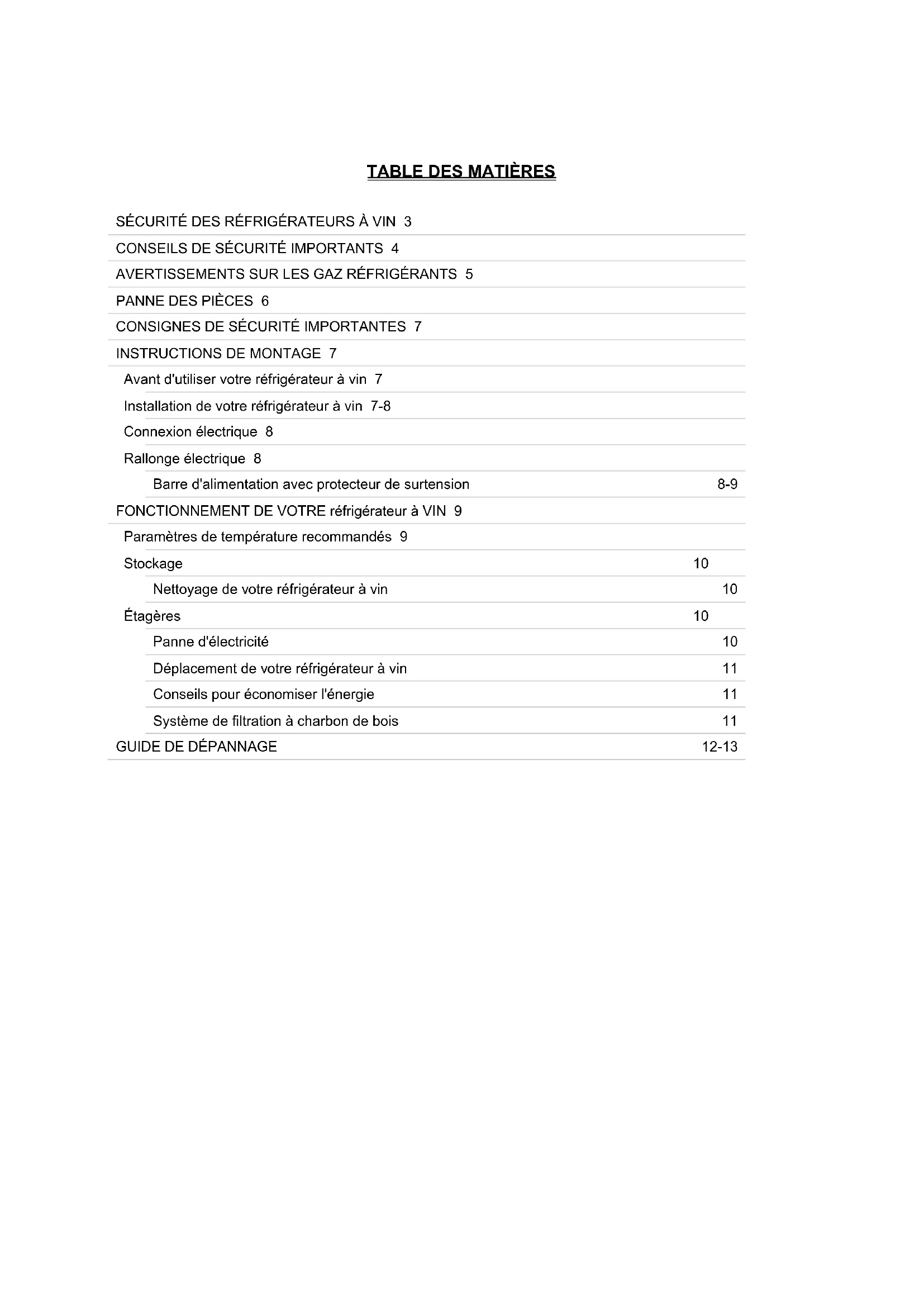 Avant d'utiliser votre réfrigérateur à vin 7 Installation de votre réfrigérateur à vin 7-8 Connexion électrique 8 Rallonge électrique 8 Barre d'alimentation avec protecteur de surtension 8-9 FONCTIONNEMENT DE VOTRE réfrigérateur à VIN 9 Paramètres de température recommandés 9 Stockage 10 Nettoyage de votre réfrigérateur à vin 10 Étagères 10 Panne d'électricité 10 Déplacement de votre réfrigérateur à vin 11 Conseils pour économiser l'énergie 11 Système de filtration à charbon de bois 11