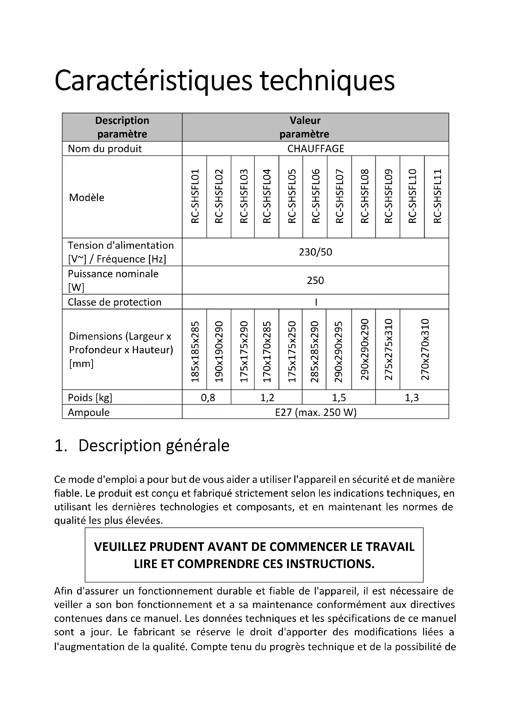 Problème Cause possible Opérations Dispositif ne marche pas. Le dispositif n’est pas allume. Vérifiez si le dispositif est correctement branché et allumé. Endommagement du câble électrique. Faites réparer à un électricien.Ampoule n’est pas bien serrée ou elle est endommagée. Serrez ou remplacez l’ampoule. Aucune tension dans l’installation électrique. Vérifiez les fusibles.Dati tecnici Descrizione del parametro Valore del parametro Nome del prodotto TERMOVENTILATORE Modello RC-SHSFL01 RC-SHSFL02 RC-SHSFL03 RC-SHSFL04 RC-SHSFL05 RC-SHSFL06 RC-SHSFL07 RC-SHSFL08 RC-SHSFL09 RC-SHSFL10 RC-SHSFL11 Tensione di alimentazione [V~] / Frequenza [Hz] 230/50 Potenza nominale [W]