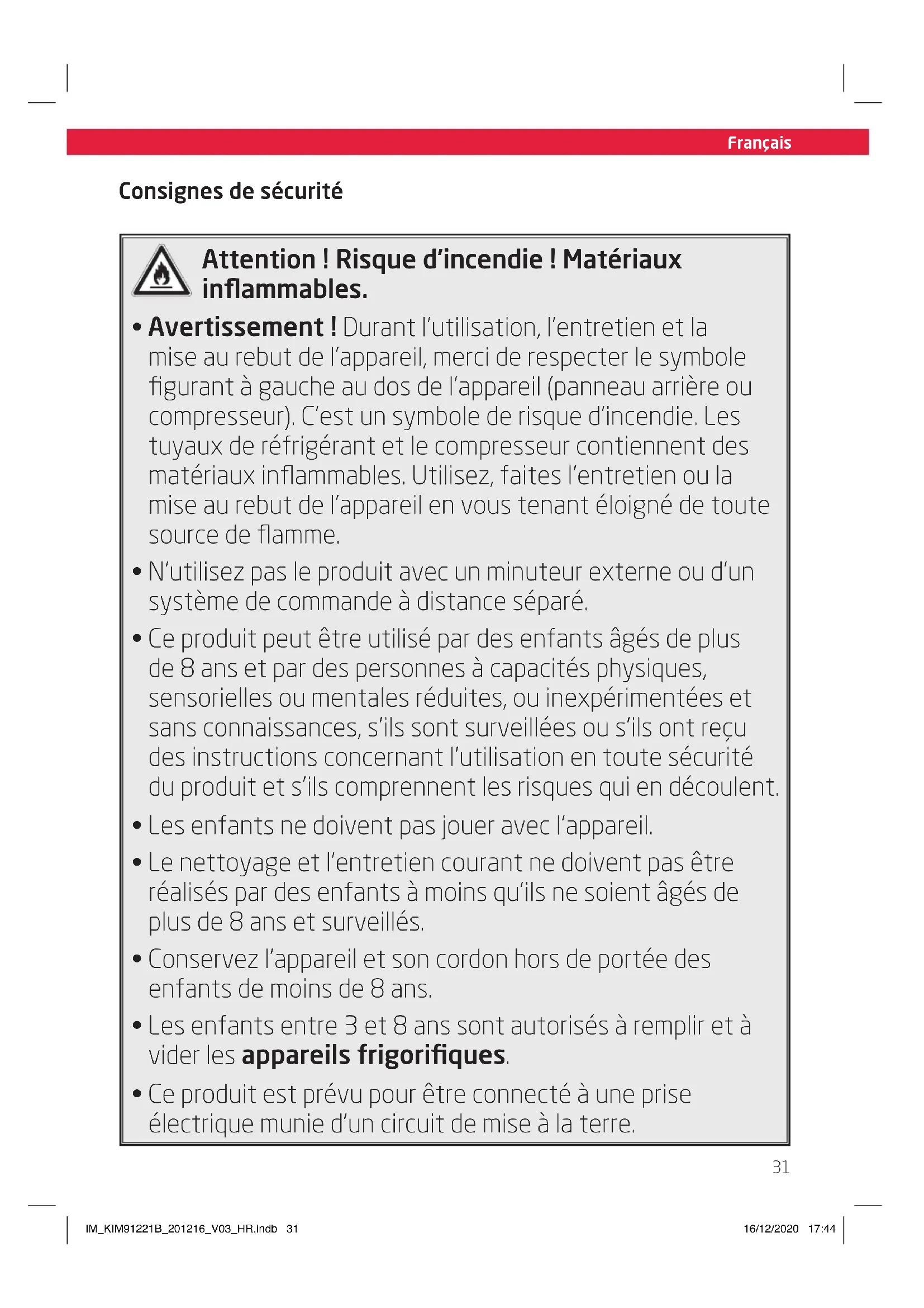 - L’appareil contient un gaz d’isolation explosif et doit donc être éliminé par des centres spécialisés. IM_KIM91221B_201216_V03_HR.indb 32IM_KIM91221B_201216_V03_HR.indb 32 16/12/2020 17:4416/12/2020 17:44Français