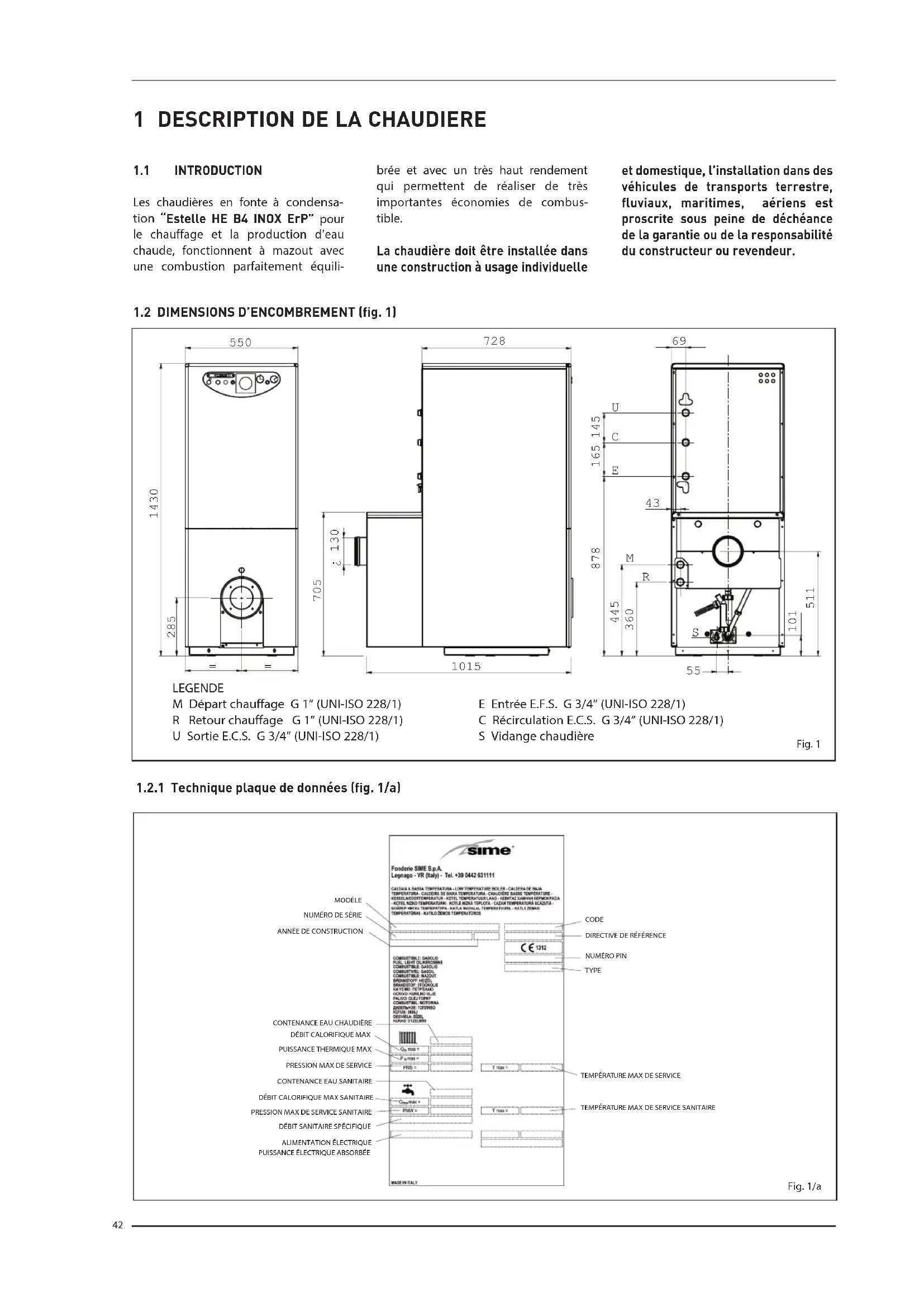 Les chaudières en fonte à condensa- tion “Estelle HE B4 INOX ErP” pour le chauffage et la production d’eau chaude, fonctionnent à mazout avec une combustion parfaitement équili- brée et avec un très haut rendement qui permettent de réaliser de très importantes économies de combus- tible. La chaudière doit être installée dans une construction à usage individuelle et domestique, l’installation dans des véhicules de transports terrestre, fluviaux, maritimes, aériens est proscrite sous peine de déchéance de la garantie ou de la responsabilité du constructeur ou revendeur.