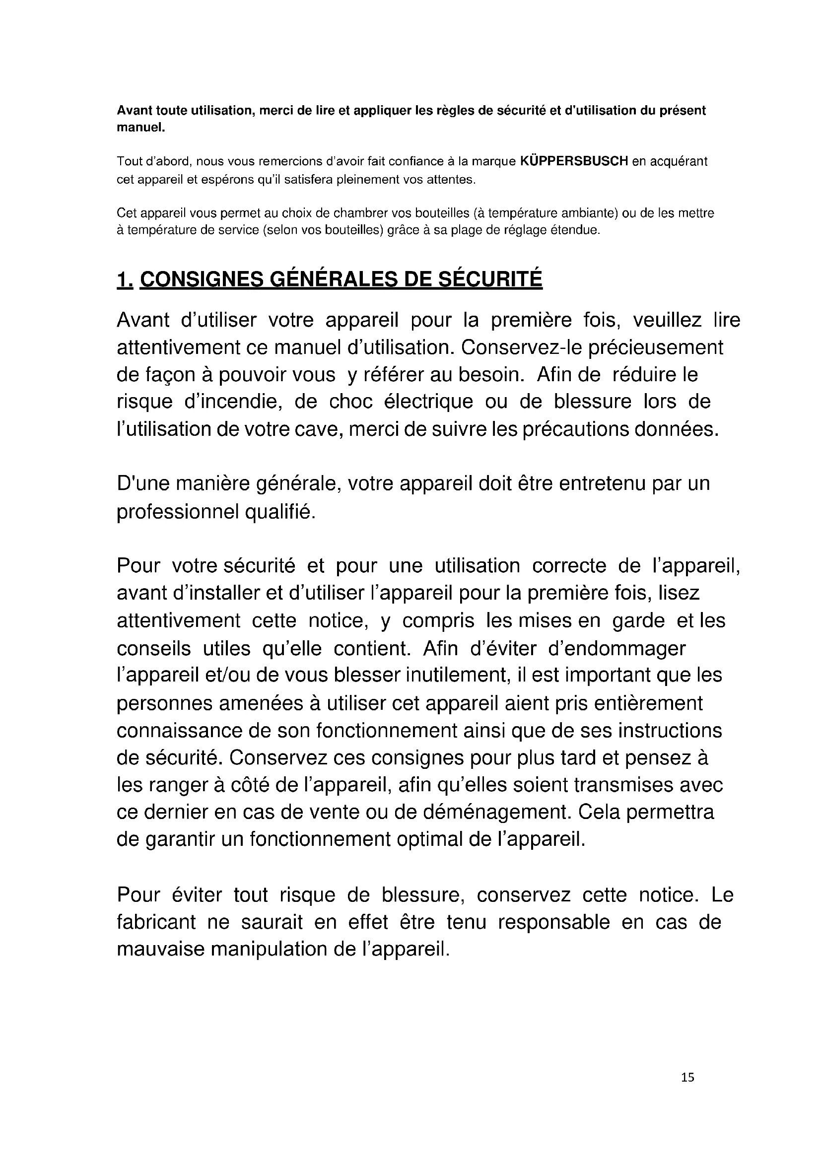 Avant toute utilisation, merci de lire et appliquer les règles de sécurité et d'utilisation du présent manuel. Tout d’abord, nous vous remercions d’avoir fait confiance à la marque KÜPPERSBUSCH en acquérant cet appareil et espérons qu’il satisfera pleinement vos attentes. Cet appareil vous permet au choix de chambrer vos bouteilles (à température ambiante) ou de les mettre à température de service (selon vos bouteilles) grâce à sa plage de réglage étendue.