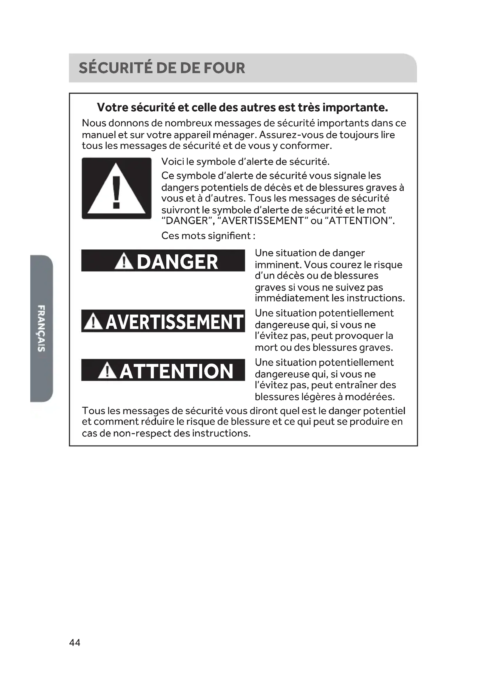 Votre sécurité et celle des autres est très importante. DANGER AVERTISSEMENT ATTENTION Voici le symbole d’alerte de sécurité. Ce symbole d’alerte de sécurité vous signale les dangers potentiels de décès et de blessures graves à vous et à d’autres. Tous les messages de sécurité suivront le symbole d’alerte de sécurité et le mot “DANGER”, “AVERTISSEMENT” ou “ATTENTION”. Ces mots signifient : Une situation de danger imminent. Vous courez le risque d’un décès ou de blessures graves si vous ne suivez pas immédiatement les instructions. Une situation potentiellement dangereuse qui, si vous ne l’évitez pas, peut provoquer la mort ou des blessures graves. Une situation potentiellement dangereuse qui, si vous ne l’évitez pas, peut entraîner des blessures légères à modérées. Tous les messages de sécurité vous diront quel est le danger potentiel et comment réduire le risque de blessure et ce qui peut se produire en cas de non-respect des instructions. Nous donnons de nombreux messages de sécurité importants dans ce manuel et sur votre appareil ménager. Assurez-vous de toujours lire tous les messages de sécurité et de vous y conformer.45