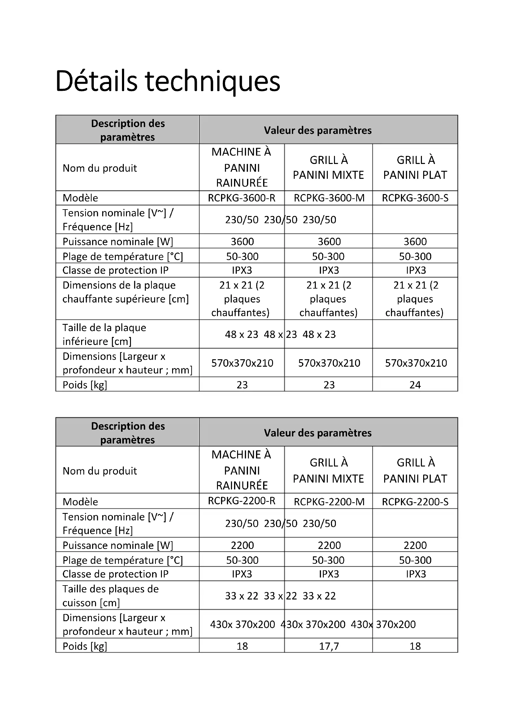 Description des paramètres Valeur des paramètres Nom du produit MACHINE À PANINI RAINURÉE GRILL À PANINI MIXTE GRILL À PANINI PLAT Modèle RCPKG-2200-R RCPKG-2200-M RCPKG-2200-S Tension nominale [V~] / Fréquence [Hz] 230/50 230/50 230/50 Puissance nominale [W]
