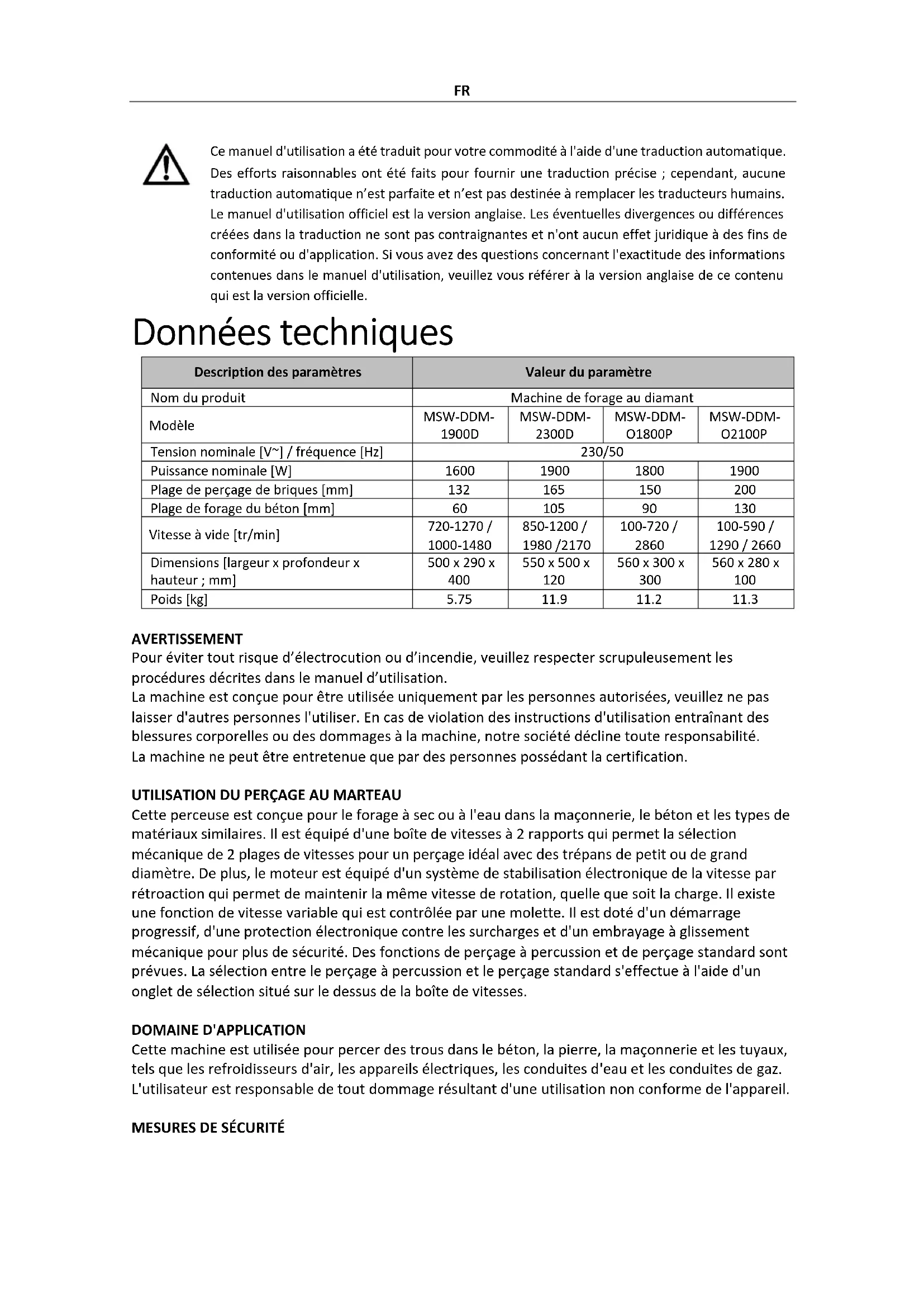 Po cca 300 hodinách používání stroje byste měli zkontrolovat opotřebení uhlíkových kartáčů a v případě potřeby je vyměnit. Jako každou jinou práci na motoru musí i tuto provést odborník na elektro.FR Ce manuel d'utilisation a été traduit pour votre commodité à l'aide d'une traduction automatique. Des efforts raisonnables ont été faits pour fournir une traduction précise ; cependant, aucune traduction automatique n’est parfaite et n’est pas destinée à remplacer les traducteurs humains. Le manuel d'utilisation officiel est la version anglaise. Les éventuelles divergences ou différences créées dans la traduction ne sont pas contraignantes et n'ont aucun effet juridique à des fins de conformité ou d'application. Si vous avez des questions concernant l'exactitude des informations contenues dans le manuel d'utilisation, veuillez vous référer à la version anglaise de ce contenu qui est la version officielle. Données techniques Description des paramètres Valeur du paramètre Nom du produit Machine de forage au diamant Modèle MSW-DDM- 1900D MSW-DDM- 2300D MSW-DDM- O1800P MSW-DDM- O2100P Tension nominale [V~] / fréquence [Hz] 230/50 Puissance nominale [W]