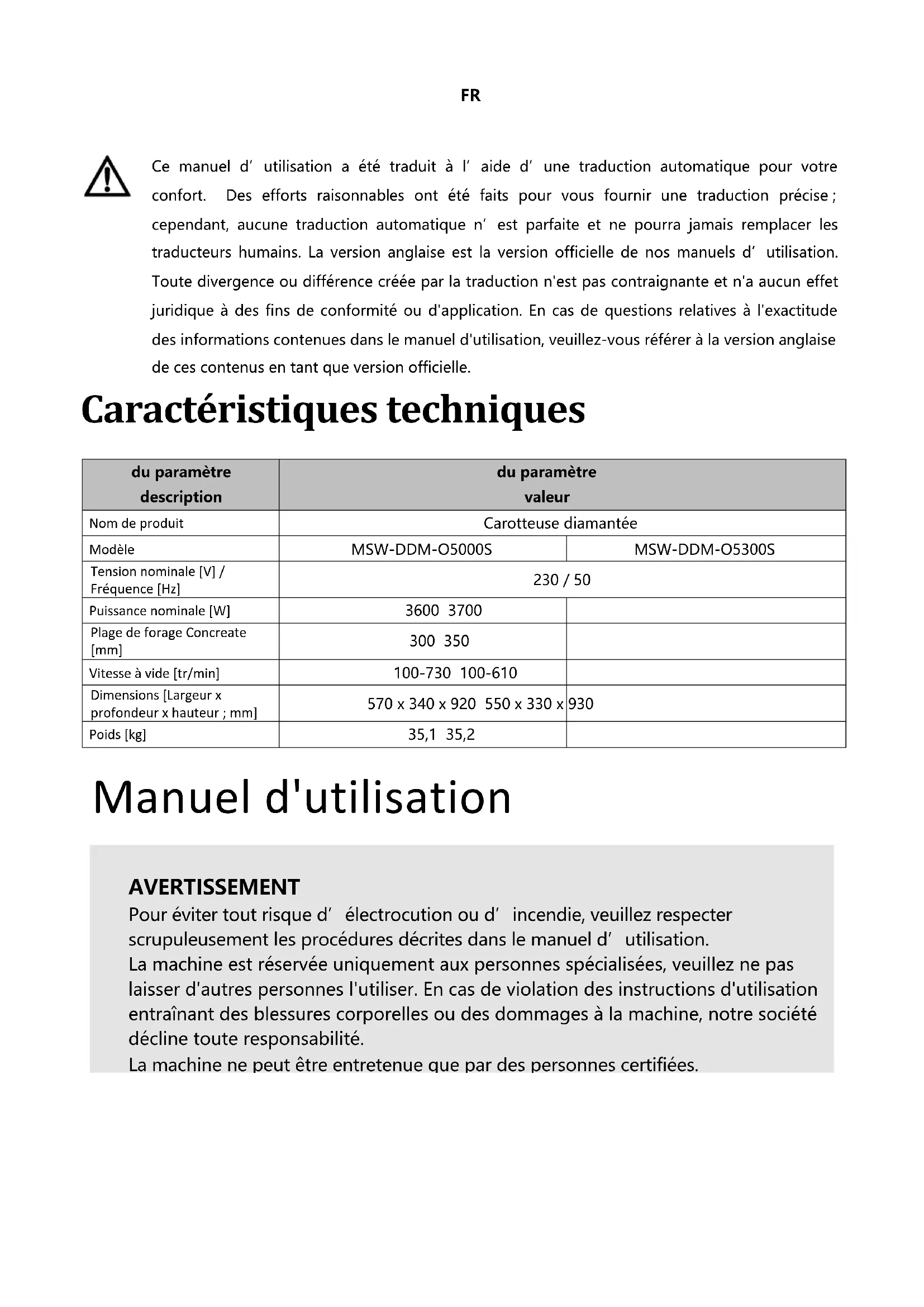 Tension nominale [V] / Fréquence [Hz] 230 / 50 Puissance nominale [W] 3600 3700 Plage de forage Concreate [mm] 300 350 Vitesse à vide [tr/min] 100-730 100-610 Dimensions [Largeur x profondeur x hauteur ; mm] 570 x 340 x 920 550 x 330 x 930 Poids [kg] 35,1 35,2 Manuel d'utilisationFR
