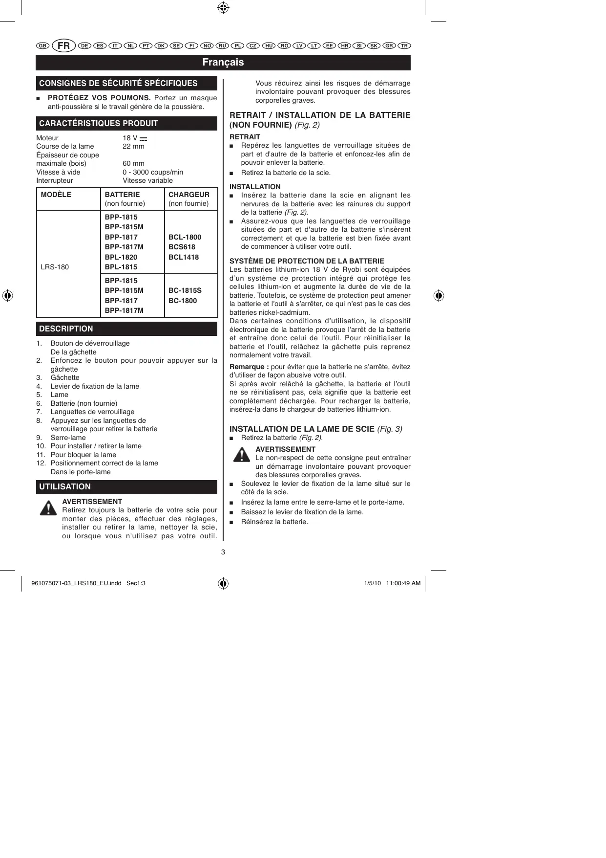 LRS180 - Outils électriques RYOBI - Notice d'utilisation et mode d'emploi gratuit