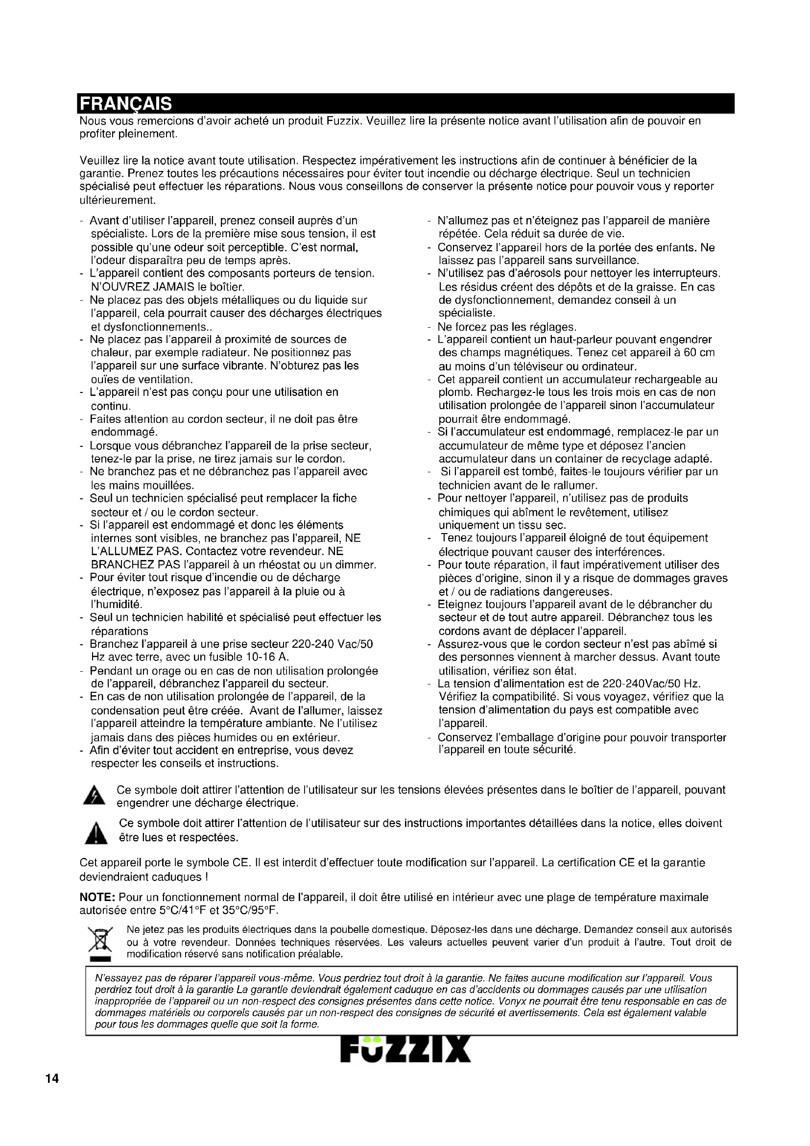 FRANÇAIS Nous vous remercions d’avoir acheté un produit Fuzzix. Veuillez lire la présente notice avant l’utilisation afin de pouvoir en profiter pleinement. Veuillez lire la notice avant toute utilisation. Respectez impérativement les instructions afin de continuer à bénéficier de la garantie. Prenez toutes les précautions nécessaires pour éviter tout incendie ou décharge électrique. Seul un technicien spécialisé peut effectuer les réparations. Nous vous conseillons de conserver la présente notice pour pouvoir vous y reporter ultérieurement. - Avant d’utiliser l’appareil, prenez conseil auprès d’un spécialiste. Lors de la première mise sous tension, il est possible qu’une odeur soit perceptible. C’est normal, l’odeur disparaîtra peu de temps après. - L’appareil contient des composants porteurs de tension. N’OUVREZ JAMAIS le boîtier. - Ne placez pas des objets métalliques ou du liquide sur l’appareil, cela pourrait causer des décharges électriques et dysfonctionnements.. - Ne placez pas l’appareil à proximité de sources de chaleur, par exemple radiateur. Ne positionnez pas l’appareil sur une surface vibrante. N’obturez pas les ouïes de ventilation. - L’appareil n’est pas conçu pour une utilisation en continu. - Faites attention au cordon secteur, il ne doit pas être endommagé. - Lorsque vous débranchez l’appareil de la prise secteur, tenez-le par la prise, ne tirez jamais sur le cordon. - Ne branchez pas et ne débranchez pas l’appareil avec les mains mouillées. - Seul un technicien spécialisé peut remplacer la fiche secteur et / ou le cordon secteur. - Si l’appareil est endommagé et donc les éléments internes sont visibles, ne branchez pas l’appareil, NE L’ALLUMEZ PAS. Contactez votre revendeur. NE BRANCHEZ PAS l’appareil à un rhéostat ou un dimmer. - Pour éviter tout risque d’incendie ou de décharge électrique, n’exposez pas l’appareil à la pluie ou à l’humidité. - Seul un technicien habilité et spécialisé peut effectuer les réparations - Branchez l’appareil à une prise secteur 220-240 Vac/50 Hz avec terre, avec un fusible 10-16 A. - Pendant un orage ou en cas de non utilisation prolongée de l’appareil, débranchez l’appareil du secteur. - En cas de non utilisation prolongée de l’appareil, de la condensation peut être créée. Avant de l’allumer, laissez l’appareil atteindre la température ambiante. Ne l’utilisez jamais dans des pièces humides ou en extérieur. - Afin d’éviter tout accident en entreprise, vous devez respecter les conseils et instructions. - N’allumez pas et n’éteignez pas l’appareil de manière répétée. Cela réduit sa durée de vie. - Conservez l’appareil hors de la portée des enfants. Ne laissez pas l’appareil sans surveillance. - N’utilisez pas d’aérosols pour nettoyer les interrupteurs. Les résidus créent des dépôts et de la graisse. En cas de dysfonctionnement, demandez conseil à un spécialiste. - Ne forcez pas les réglages. - L’appareil contient un haut-parleur pouvant engendrer des champs magnétiques. Tenez cet appareil à 60 cm au moins d’un téléviseur ou ordinateur. - Cet appareil contient un accumulateur rechargeable au plomb. Rechargez-le tous les trois mois en cas de non utilisation prolongée de l’appareil sinon l’accumulateur pourrait être endommagé. - Si l’accumulateur est endommagé, remplacez-le par un accumulateur de même type et déposez l’ancien accumulateur dans un container de recyclage adapté. - Si l’appareil est tombé, faites-le toujours vérifier par un technicien avant de le rallumer. - Pour nettoyer l’appareil, n’utilisez pas de produits chimiques qui abîment le revêtement, utilisez uniquement un tissu sec. - Tenez toujours l’appareil éloigné de tout équipement électrique pouvant causer des interférences. - Pour toute réparation, il faut impérativement utiliser des pièces d’origine, sinon il y a risque de dommages graves et / ou de radiations dangereuses. - Eteignez toujours l’appareil avant de le débrancher du secteur et de tout autre appareil. Débranchez tous les cordons avant de déplacer l’appareil. - Assurez-vous que le cordon secteur n’est pas abîmé si des personnes viennent à marcher dessus. Avant toute utilisation, vérifiez son état. - La tension d’alimentation est de 220-240Vac/50 Hz. Vérifiez la compatibilité. Si vous voyagez, vérifiez que la tension d’alimentation du pays est compatible avec l’appareil. - Conservez l’emballage d’origine pour pouvoir transporter l’appareil en toute sécurité. Ce symbole doit attirer l’attention de l’utilisateur sur les tensions élevées présentes dans le boîtier de l’appareil, pouvant engendrer une décharge électrique. Ce symbole doit attirer l’attention de l’utilisateur sur des instructions importantes détaillées dans la notice, elles doivent être lues et respectées. Cet appareil porte le symbole CE. Il est interdit d’effectuer toute modification sur l’appareil. La certification CE et la garantie deviendraient caduques ! NOTE: Pour un fonctionnement normal de l’appareil, il doit être utilisé en intérieur avec une plage de température maximale autorisée entre 5°C/41°F et 35°C/95°F. Ne jetez pas les produits électriques dans la poubelle domestique. Déposez-les dans une décharge. Demandez conseil aux autorisés ou à votre revendeur. Données techniques réservées. Les valeurs actuelles peuvent varier d’un produit à l’autre. Tout droit de modification réservé sans notification préalable. N’essayez pas de réparer l’appareil vous-même. Vous perdriez tout droit à la garantie. Ne faites aucune modification sur l’appareil. Vous perdriez tout droit à la garantie La garantie deviendrait également caduque en cas d’accidents ou dommages causés par une utilisation inappropriée de l’appareil ou un non-respect des consignes présentes