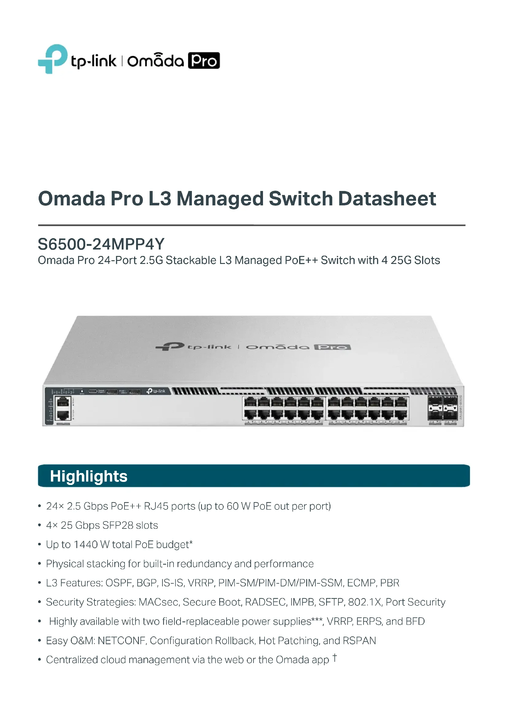 | Caractéristiques techniques | Commutateur TP-LINK Omada Pro S650024MPP4Y, 24 ports, gestion intelligente, PoE+. |