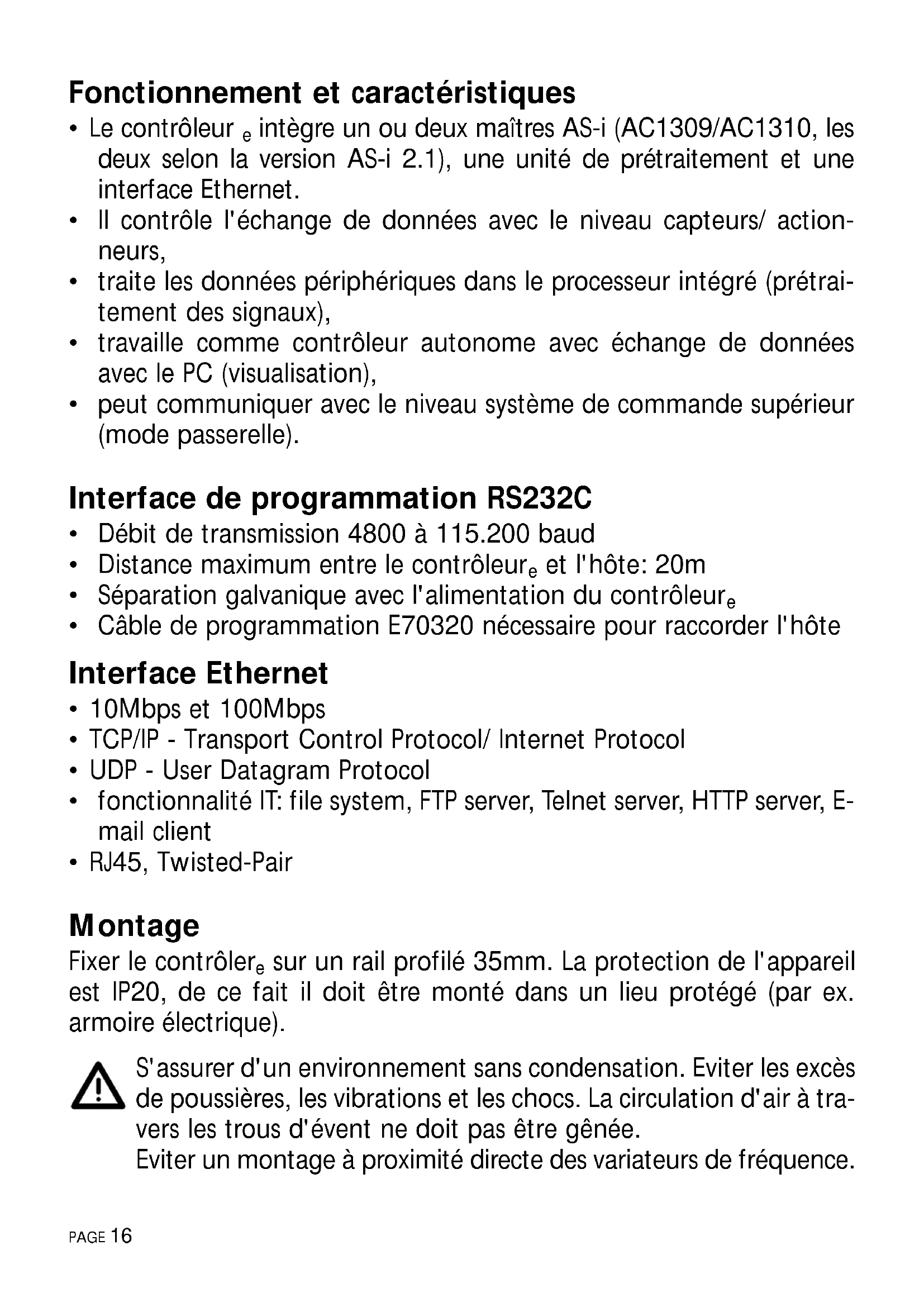 PWR/COM PROJ CONF/PF PWR/COM PROJ CONF/PF 24V PWR PLC RUN address state Modbus/TCP link activity Ethernet Voyants LED et raccordement des bornes Interface Ethernet affichage boutons seulement AC1310Réglage du contraste Le contraste peut être modifié directement en appuyant simultané- ment sur le bouton droit et le bouton ∆ (trop clair) ou le bouton ∇ (trop foncé). Fonctionnement Pour le fonctionnement d'un système AS-i une alimentation AS-i spé- cifique est nécessaire (par ex. AC1216). L'alimentation AS-i alimente le câble AS-i jaune en énergie et réalise un découplage des données par rapport au régulateur de tension de l'alimentation. Des alimentations à découpage standard considéreraient les signaux de données AS-i comme des signaux parasites et les supprimeraient. Déconnecter l'alimentation avant de raccorder le contrôleur