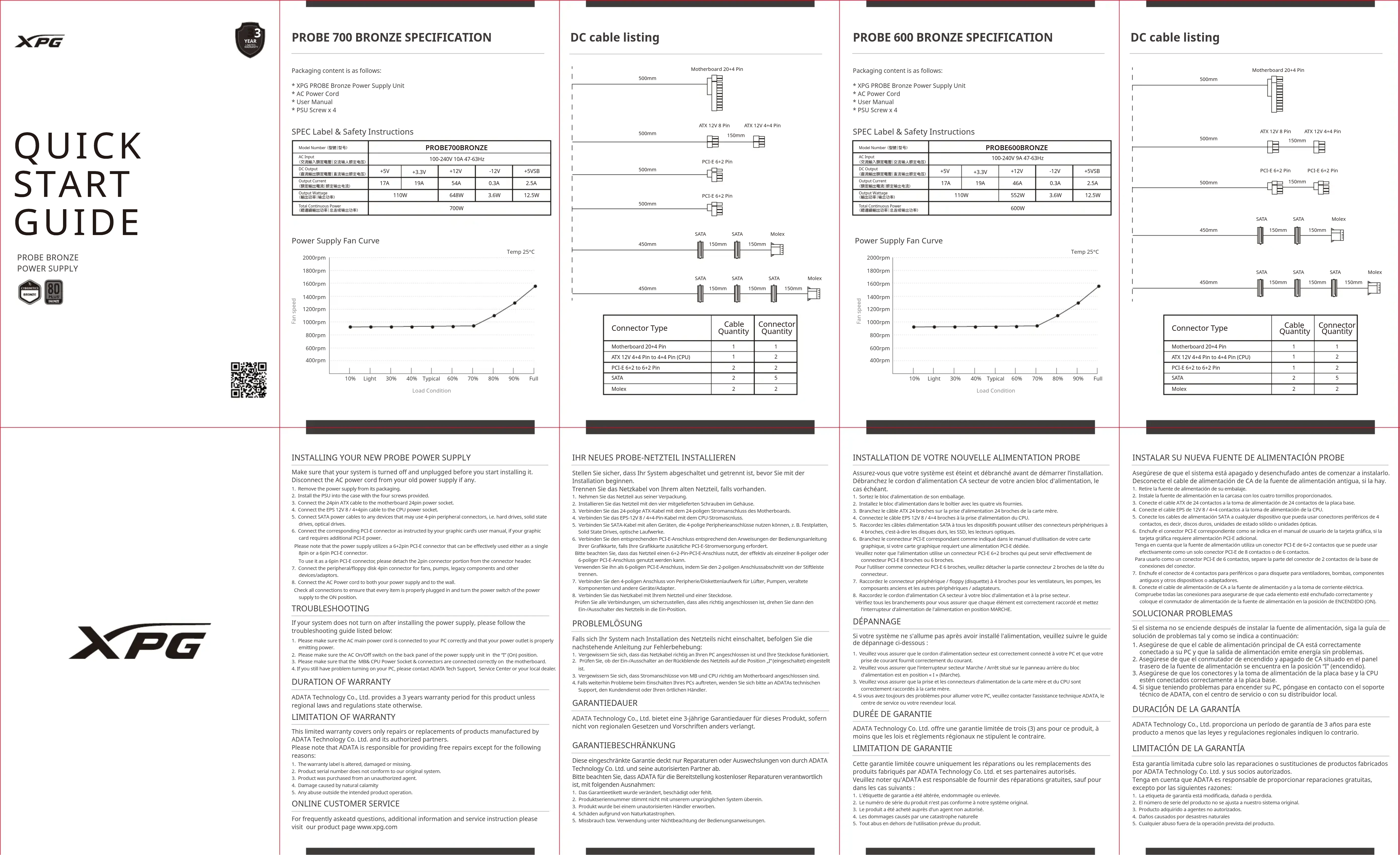4 broches, c'est-à-dire les disques durs, les SSD, les lecteurs optiques. 6. Branchez le connecteur PCI-E correspondant comme indiqué dans le manuel d'utilisation de votre carte graphique, si votre carte graphique requiert une alimentation PCI-E dédiée. Veuillez noter que l'alimentation utilise un connecteur PCI-E 6+2 broches qui peut servir effectivement de connecteur PCI-E 8 broches ou 6 broches. Pour l'utiliser comme connecteur PCI-E 6 broches, veuillez détacher la partie connecteur 2 broches de la tête du connecteur.7. Raccordez le connecteur périphérique / floppy (disquette) à 4 broches pour les ventilateurs, les pompes, les composants anciens et les autres périphériques / adaptateurs.8. Raccordez le cordon d'alimentation CA secteur à votre bloc d'alimentation et à la prise secteur. Vérifiez tous les branchements pour vous assurer que chaque élément est correctement raccordé et mettez l'interrupteur d'alimentation de l'alimentation en position MARCHE.Assurez-vous que votre système est éteint et débranché avant de démarrer l’installation.Débranchez le cordon d'alimentation CA secteur de votre ancien bloc d'alimentation, le cas échéant. DÉPANNAGE 1. Veuillez vous assurer que le cordon d'alimentation secteur est correctement connecté à votre PC et que votre prise de courant fournit correctement du courant.2. Veuillez vous assurer que l'interrupteur secteur Marche / Arrêt situé sur le panneau arrière du bloc d'alimentation est en position « I » (Marche).3. Veuillez vous assurer que la prise et les connecteurs d'alimentation de la carte mère et du CPU sont correctement raccordés à la carte mère.4. Si vous avez toujours des problèmes pour allumer votre PC, veuillez contacter l’assistance technique ADATA, le centre de service ou votre revendeur local.1. L'étiquette de garantie a été altérée, endommagée ou enlevée.2. Le numéro de série du produit n'est pas conforme à notre système original.3. Le produit a été acheté auprès d'un agent non autorisé.4. Les dommages causés par une catastrophe naturelle5. Tout abus en dehors de l'utilisation prévue du produit.Si votre système ne s'allume pas après avoir installé l'alimentation, veuillez suivre le guide de dépannage ci-dessous :