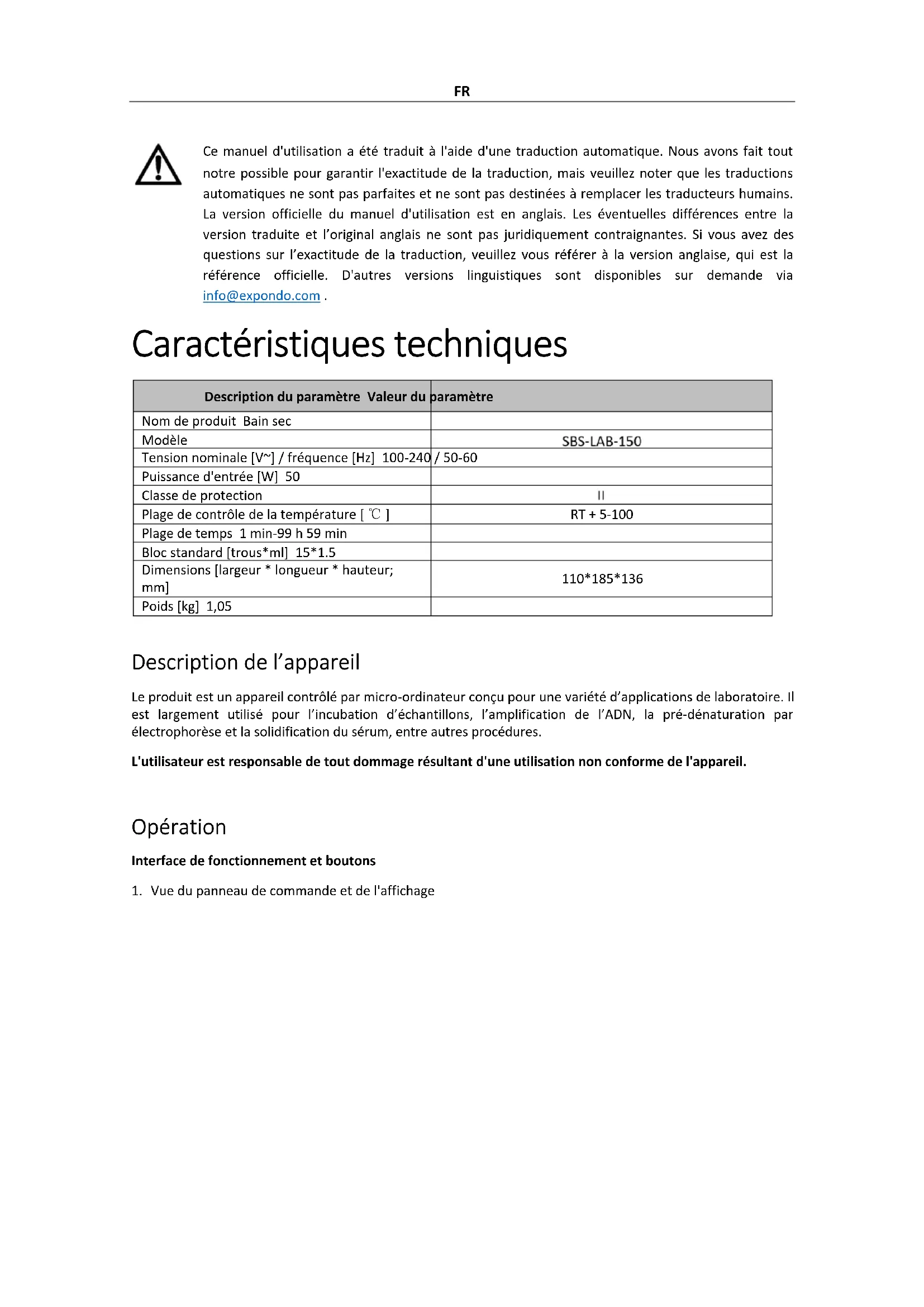 a) Appuyez sur le bouton pour combiner les points de température de S1, S2, S3, S4 et S5 dans des programmes de connexion multipoints, tels que S1-S2, S1-S2-S3, S1-S2-S3-S4 ou S1-S2-S3-S4-S5. AVIS! Le point de température du programme multipoint ne peut démarrer qu'à partir de S1. b) Par exemple, pour définir un programme de connexion pour S1-S2-S3-S4, appuyez sur la touche bouton. L'écran affichera la configuration actuelle, où S1 est le nœud de départ (qui ne peut pas être modifié) et S2 est le nœud final (qui peut être modifié). Appuyez sur le bouton pour changer S2 en S4. Appuyez ensuite sur bouton pour confirmer le réglage. La configuration du nœud sera affichée sous la forme S1-4 et le programme s'exécutera via la séquence S1-S2-S3-S4. c) Presse Appuyez à nouveau sur le bouton pour exécuter le programme de connexion à quatre points S1-S2-S3-S4.FR Exploiter le programme multipoint AVIS! Après avoir sélectionné le nœud final, vous pouvez appuyer sur bouton pour exécuter directement le programme multipoint. Nettoyage et entretien Utilisez un chiffon propre et doux imbibé d'une petite quantité d'alcool anhydre pour nettoyer les trous coniques des blocs de l'instrument. Cela garantit un contact complet et une conduction thermique efficace entre le tube à essai et les trous coniques, tout en empêchant la contamination. Si des taches apparaissent sur la surface de l'instrument, nettoyez-le avec un chiffon doux et une pâte nettoyante douce. PRUDENCE Assurez-vous que l’alimentation électrique est coupée avant de nettoyer l’instrument. NE PAS laisser les agents de nettoyage pénétrer dans les trous coniques pendant le nettoyage. Évitez d’utiliser des agents de nettoyage corrosifs sur la surface de l’instrument. Élimination des appareils usagés Ne jetez pas cet appareil dans les déchets municipaux. Remettez-le à un point de collecte et de recyclage des appareils électriques et électroniques. Vérifiez le symbole sur le produit, le manuel d’instructions et l’emballage. Les plastiques utilisés pour construire l'appareil peuvent être recyclés en suivant leurs marquages. En choisissant de recycler, vous contribuez significativement à la protection de notre environnement. Contactez les autorités locales pour obtenir des informations sur votre centre de recyclage local.IT Questo manuale utente è stato tradotto utilizzando la traduzione automatica. Abbiamo fatto ogni sforzo per garantire l'accuratezza della traduzione, ma tieni presente che le traduzioni automatiche non sono perfette e non intendono sostituire i traduttori umani. La versione ufficiale del Manuale d'uso è in inglese. Eventuali differenze tra la versione tradotta e quella originale in inglese non sono giuridicamente vincolanti. In caso di dubbi sull'accuratezza della traduzione, fare riferimento alla versione inglese, che è il riferimento ufficiale. Versioni in altre lingue sono disponibili su richiesta scrivendo a info@expondo.com . Dati tecnici Descrizione del parametro Valore del parametro Nome del prodotto Bagno a secco Modello Tensione nominale [V~] / frequenza [Hz] 100-240 / 50-60 Potenza in ingresso [W] 50 Classe di protezione Intervallo di controllo della temperatura [ ℃ ] RT + 5-100 Intervallo di tempo 1min-99h59min Blocco standard [fori*ml] 15*1.5 Dimensioni [larghezza * lunghezza * altezza; mm] 110*185*136 Peso [kg] 1,05 Descrizione del dispositivo Il prodotto è un dispositivo controllato da microcomputer progettato per una varietà di applicazioni di laboratorio. È ampiamente utilizzato per l'incubazione dei campioni, l'amplificazione del DNA, la pre- denaturazione dell'elettroforesi e la solidificazione del siero, tra le altre procedure. L'utente è responsabile di eventuali danni derivanti da un uso improprio del dispositivo. Operazione Interfaccia operativa e pulsanti
