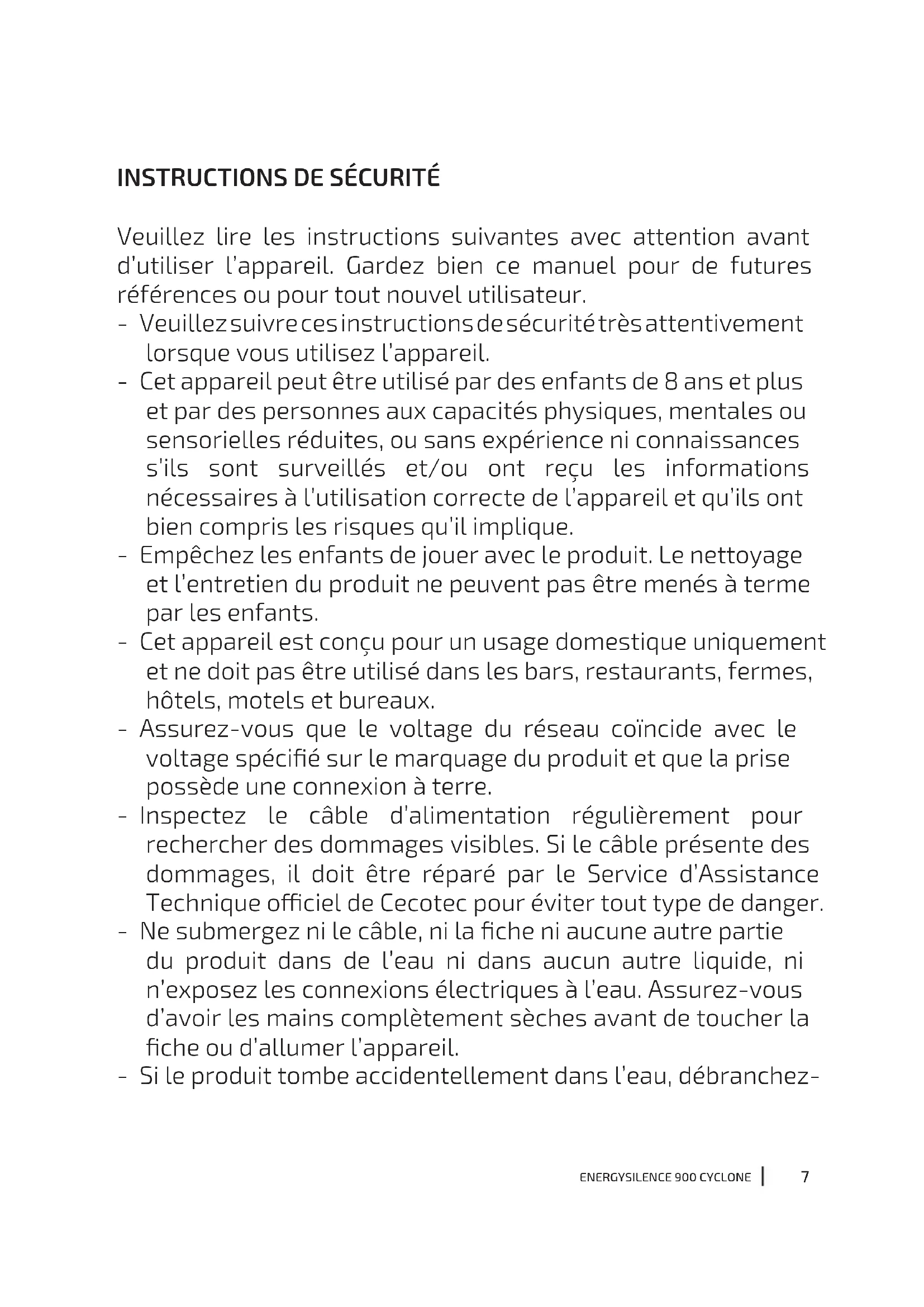 Veuillez lire les instructions suivantes avec attention avant d’utiliser l’appareil. Gardez bien ce manuel pour de futures références ou pour tout nouvel utilisateur. - Veuillez suivre ces instructions de sécurité très attentivement lorsque vous utilisez l’appareil. - Cet appareil peut être utilisé par des enfants de 8 ans et plus et par des personnes aux capacités physiques, mentales ou sensorielles réduites, ou sans expérience ni connaissances s’ils sont surveillés et/ou ont reçu les informations nécessaires à l’utilisation correcte de l’appareil et qu’ils ont bien compris les risques qu’il implique. - Empêchez les enfants de jouer avec le produit. Le nettoyage et l’entretien du produit ne peuvent pas être menés à terme par les enfants. - Cet appareil est conçu pour un usage domestique uniquement et ne doit pas être utilisé dans les bars, restaurants, fermes, hôtels, motels et bureaux. - Assurez-vous que le voltage du réseau coïncide avec le voltage spécié sur le marquage du produit et que la prise possède une connexion à terre. - Inspectez le câble d’alimentation régulièrement pour rechercher des dommages visibles. Si le câble présente des dommages, il doit être réparé par le Service d’Assistance Technique ociel de Cecotec pour éviter tout type de danger. - Ne submergez ni le câble, ni la che ni aucune autre partie du produit dans de l’eau ni dans aucun autre liquide, ni n’exposez les connexions électriques à l’eau. Assurez-vous d’avoir les mains complètement sèches avant de toucher la che ou d’allumer l’appareil. - Si le produit tombe accidentellement dans l’eau, débranchez-ENERGYSILENCE 900 CYCLONE