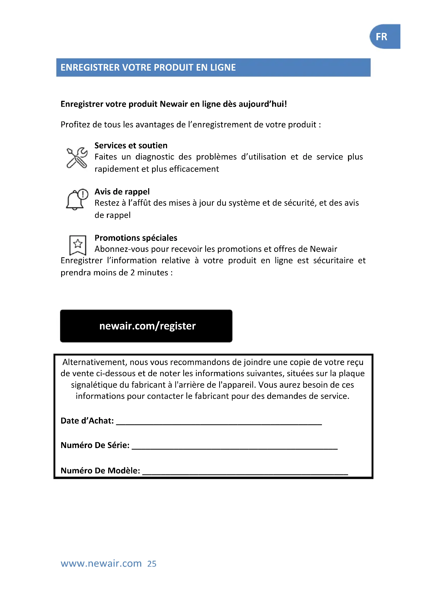 Alternativement, nous vous recommandons de joindre une copie de votre reçu de vente ci-dessous et de noter les informations suivantes, situées sur la plaque signalétique du fabricant à l'arrière de l'appareil. Vous aurez besoin de ces informations pour contacter le fabricant pour des demandes de service. Date d’Achat: ____________________________________________ Numéro De Série: ____________________________________________ Numéro De Modèle: ____________________________________________ newair.com/registerFR