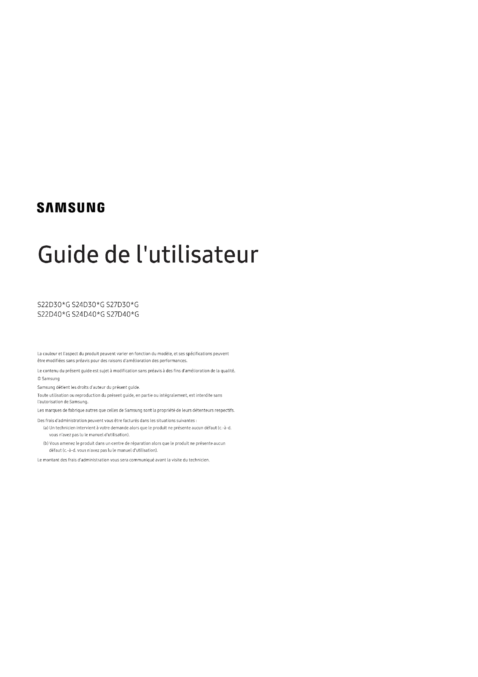 Guide de l'utilisateur La couleur et l'aspect du produit peuvent varier en fonction du modèle, et ses spécifications peuvent être modifiées sans préavis pour des raisons d'amélioration des performances. Le contenu du présent guide est sujet à modification sans préavis à des fins d'amélioration de la qualité. © Samsung Samsung détient les droits d'auteur du présent guide. Toute utilisation ou reproduction du présent guide, en partie ou intégralement, est interdite sans l'autorisation de Samsung. Les marques de fabrique autres que celles de Samsung sont la propriété de leurs détenteurs respectifs. Des frais d'administration peuvent vous être facturés dans les situations suivantes: (a) Un technicien intervient à votre demande alors que le produit ne présente aucun défaut (c.-à-d. vous n'avez pas lu le manuel d'utilisation). (b) Vous amenez le produit dans un centre de réparation alors que le produit ne présente aucun défaut (c.-à-d. vous n'avez pas lu le manuel d'utilisation). Le montant des frais d'administration vous sera communiqué avant la visite du technicien. S22D30*G S24D30*G S27D30*G S22D40*G S24D40*G S27D40*GTable des matières Avant utilisation du produit Consignes de sécurité 4 Électricité et sécurité 4 Installation 5 Fonctionnement 6 Nettoyage 8 Position correcte lors de l'utilisation du produit 8 Préparatifs Installation 9 Fixation du socle 9 Précautions lors du déplacement du produit 10 Vérification de l'espace autour du produit 11 Ajustement de l'inclinaison et de la hauteur du produit 11 Rotation du produit 13 Verrou antivol 14 Spécifications du kit de montage mural (VESA) 15 Panneau de configuration 16 Guide des touches directes 17