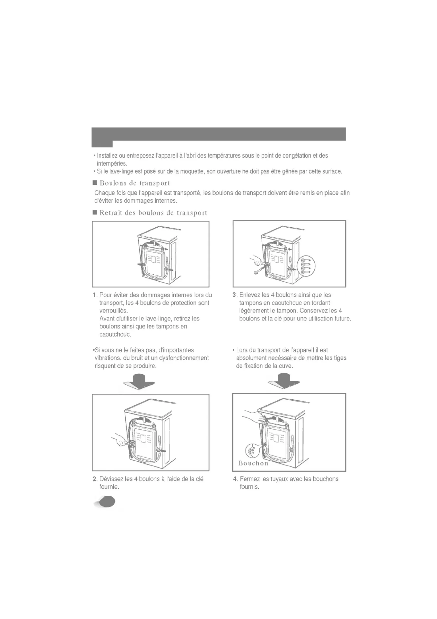 caoutchouc tordant legerement tampon. Conservezles4boulonsetlaclepour une utilisationfuture. Lorsdu transport l'appareil ilestabsolumentnecessairedemettreles tiges defixationdela cuve. Chaque foisque l'appareil est transporte, lesboulonsde transport doiventetreremis
