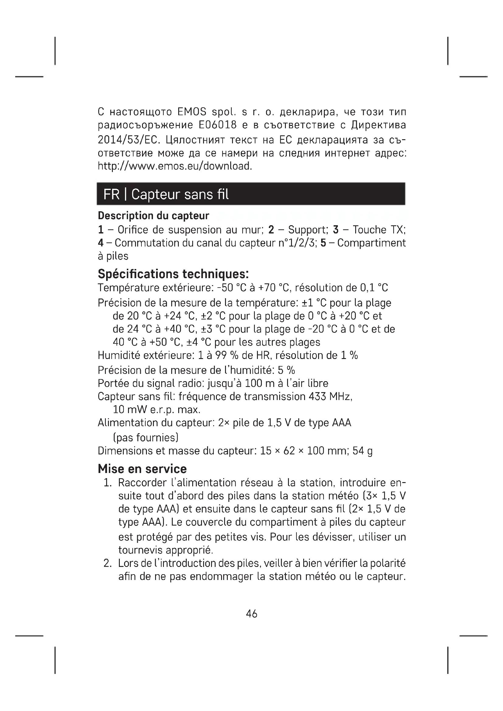 - Cet appareil n’a pas été conçu pour être utilisé par des per- sonnes (enfants compris) qui ont des capacités physiques et/ ou sensorielles limitées, qui ont des troubles mentaux ou qui ne sont pas susamment expérimentées, à moins qu’elles ne soient sous la surveillance d’une personne qui est responsable de leur sécurité ou qu’une telle personne leur ait fait suivre une formation relative à l’utilisation de l’appareil. Les enfants doivent rester sous surveillance an de les empêcher de jouer avec cet appareil. Une fois qu’ils sont devenus obsolètes, les appareils et les piles se transforment en déchets dangereux qui ne pourront pas être éliminés dans les déchets ménagers. Il conviendra donc de les remettre à un centre de collecte des déchets – par exemple dans le magasin où vous avez acheté votre appareil. Ne pas jeter avec les ordures ménagères. Utilisez des points de collecte spéciaux pour les déchets tries. Contactez les autorités locales pour obtenir des informations sur les points de collecte. Si les appareils électroniques sont mis en décharge, des substances dangereuses peuvent atteindre les eaux souter- raines et, par la suite, la chaîne alimentaire, où elles peuvent af- fecter la santé humaine. Par la présente, EMOS spol. s r. o. déclare que l‘équipement radio de type E06018 est conforme à la directive 2014/53/UE. Le texte intégral de la déclaration de conformité de l‘UE est disponible à l‘adresse Internet suivante: http://www.emos.eu/download. IT | Sensore senza li Descrizione del sensore 1 – foro per appendere al muro; 2 – staa; 3 – pulsante TX; 4 – com- mutazione del canale del sensore n. 1/2/3; 5 – vano batteria Speciche tecniche: temperatura esterna: da -50 °C a +70 °C, incremento 0,1 °C accuratezza di misurazione della temperatura: ±1 °C per l’inter- vallo da 20 °C a +24 °C, ±2 °C per l’intervallo da 0 °C a +20 °C50 e 24 °C no a +40 °C, ±3 °C per l’intervallo da -20 °C a 0 °C e 40 °C no +50 °C, ±4 °C per gli altri intervalli umidità esterna: 1–99 % di umidità relativa, incremento 1 % precisione di misurazione dell’umidità: 5 % portata del segnale radio: no a 100 m in spazio aperto sensore senza li: frequenza di trasmissione 433 MHz, 10 mW e.r.p.max. alimentazione del sensore: 2 batterie AAA da 1,5 V (non incluse) dimensioni e peso del sensore: 15 × 62 × 100 mm; 54 g Messa in servizio