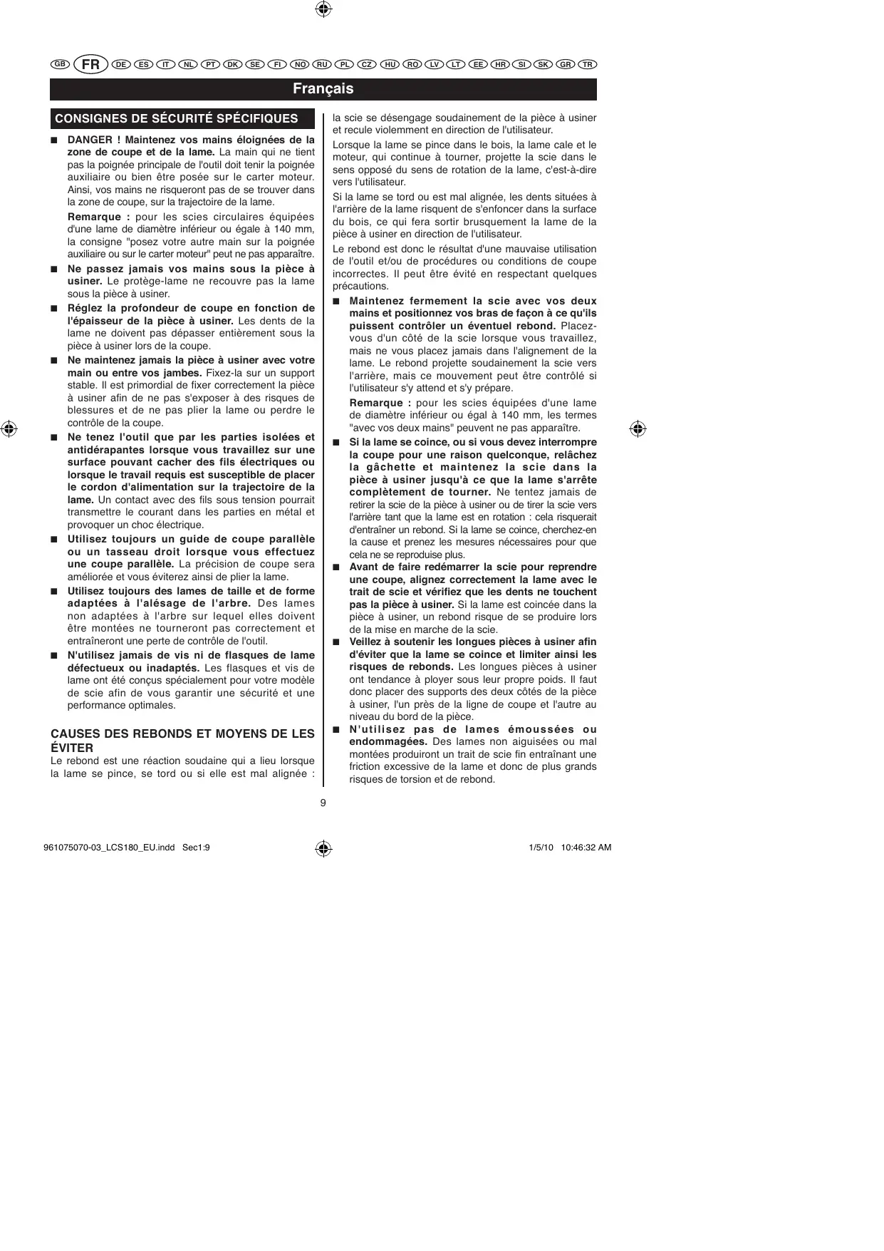 - Maintenez fermement la scie avec vos deux mains et positionnez vos bras de façon à ce qu'ils puissant contrôler un évientuel rebond. Placez-vous d'un côté de la scie lorsque vous travailliez, mais ne vous placez jamais dans l'alignement de la lame. Le rebond projette soudaientement la scie vers l'arrière, mais ce mouvement peut être contrôle si l'utilisateur s'y attend et s'y prépare.