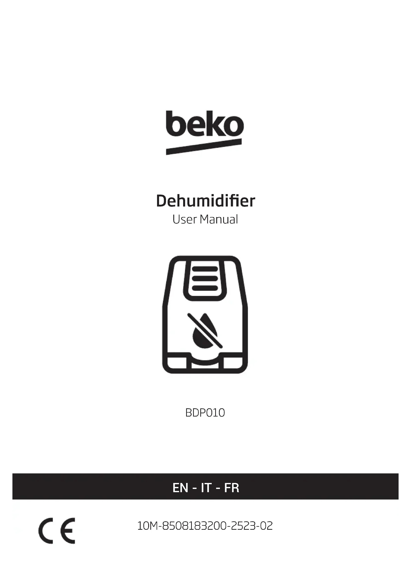dei gas fluorurati ad effetto serra è inferiore a 10 tonnellate. 9 Istruzioni per l'installazione64 / 100 IT Deumidificatore / Manuale dell'utente Nome modello BDP010 Refrigerante R290 Quantità refrigerante totale (g) 30 Protezione contro le scosse elettriche Classe I Capacità di deumidificazione nominale (27°C UR 60%) (L/giorno) 4,5 Capacità di deumidificazione nominale (30°C UR 80%) (L/giorno) 9,5 Tensione/Frequenza/Fase (V/Hz/Fase) 220 V-240 V/ 50 Hz Livello di potenza sonora - (dBA) 56/53/51 Potenza nominale di ingresso (W) 280 Corrente nominale di ingresso (A) 1,6 Intervallo UR manuale 30%-90% Temp. ambiente 5-35 Dimensioni dell'unità (L x A x P) mm 282x204x402 Peso netto unità (kg) 9,8 10 Specifiche tecnicheVeuillez d’abord lire ce manuel d’utilisation. Cher client, Nous vous remercions d’avoir acheté un produit Beko. Nous espérons que ce produit vous apportera une entière satisfaction. Tous nos produits sont fabriqués dans une usine moderne et font l’objet d’un contrôle de qualité minutieux. À cet effet, veuillez lire en intégralité la présente notice avant d’utiliser cet appareil et conservez-la soigneusement pour une utilisation ultérieure. Si vous remettez le produit à un autre utilisateur, remettez-le-lui avec la notice d’utilisation. Veillez à bien respecter les consignes et les instructions figurant dans la notice d’utilisation. Signication des pictogrammes Vous trouverez les pictogrammes suivants dans cette notice d’utilisation : PAPIER RECYCLÉ ET RECYCLABLE Informations importantes et conseils utiles concernant l’utilisation de l’appareil. Avertissement à propos des situations dangereuses qui pourraient entraîner des blessures ou des dégâts matériels. Avertissement relatif aux actions à ne jamais effectuer. Risque d’électrocution. Ce symbole indique qu’il existe des informations dans la notice d’utilisation ou le manuel d’installation. Ne pas couvrir. Ce symbole indique qu’il faut lire attentivement la notice d’utilisation. Ce symbole indique qu’un technicien doit manipuler cet équipement en suivant les instructions du manuel d’installation. (Pour le gaz réfrigérant R32/R290) Ce symbole indique que cet appareil utilise un réfrigérant inflammable. Si le réfrigérant a fui et est exposé à une source d’allumage externe, il y a un risque d’incendie.PAPIER RECYCLÉ ET RECYCLABLE Veuillez d’abord lire ce manuel d’utilisation Chère cliente, cher client, Nous vous remercions d’avoir porté votre choixsur un produit BEKO. Nous espérons que ce produit vous apportera entière satisfaction. Taus nos produits sont fabriqués dans une usine moderne et ant fait l’objet d’un contrle de qualité minutieux. A cet effet, veuillez lire en intégralité le présent manuel avant d’utiliser cet appareil, et conservez-le soigneusement pour une utilisation ultérieure. Si vous cédez ce produit à une tierce personne, n’oubliez pas de lui fournir le manuel d’utilisation également Veillez à bien respecter les consignes et les instructions figurants dans le manuel d’utilisation. Signification des pictogrammes Vous trouverez les symboles suivants dans ce manuel d’utilisation: