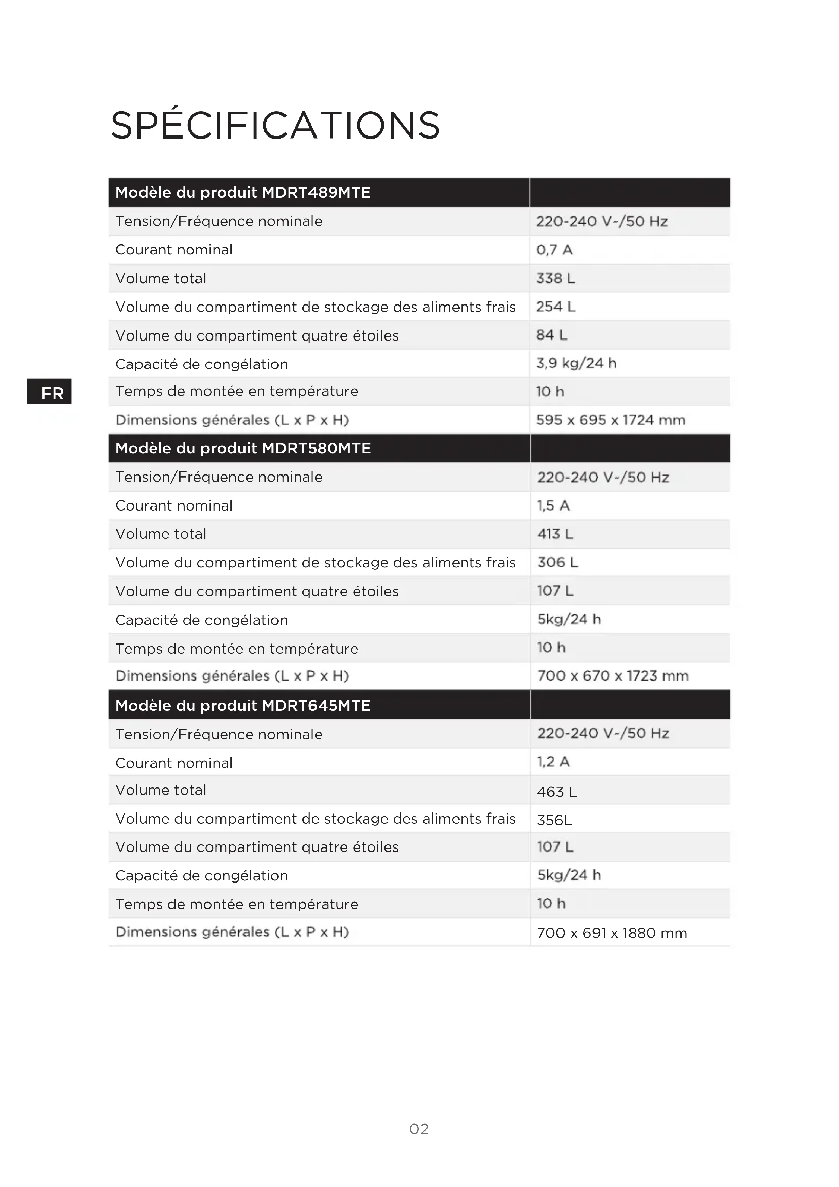 SPÉCIFICATIONS Modèle du produit MDRT580MTE Tension/Fréquence nominale Courant nominal Volume total Volume du compartiment de stockage des aliments frais Volume du compartiment quatre étoiles Capacité de congélation Temps de montée en température Modèle du produit MDRT645MTE Tension/Fréquence nominale Courant nominal Volume total Volume du compartiment de stockage des aliments frais Volume du compartiment quatre étoiles Capacité de congélation Temps de montée en température Modèle du produit MDRT489MTE Tension/Fréquence nominale Courant nominal Volume total Volume du compartiment de stockage des aliments frais Volume du compartiment quatre étoiles Capacité de congélation Temps de montée en température 463 L 356L 700 x 691 x 1880 mm03