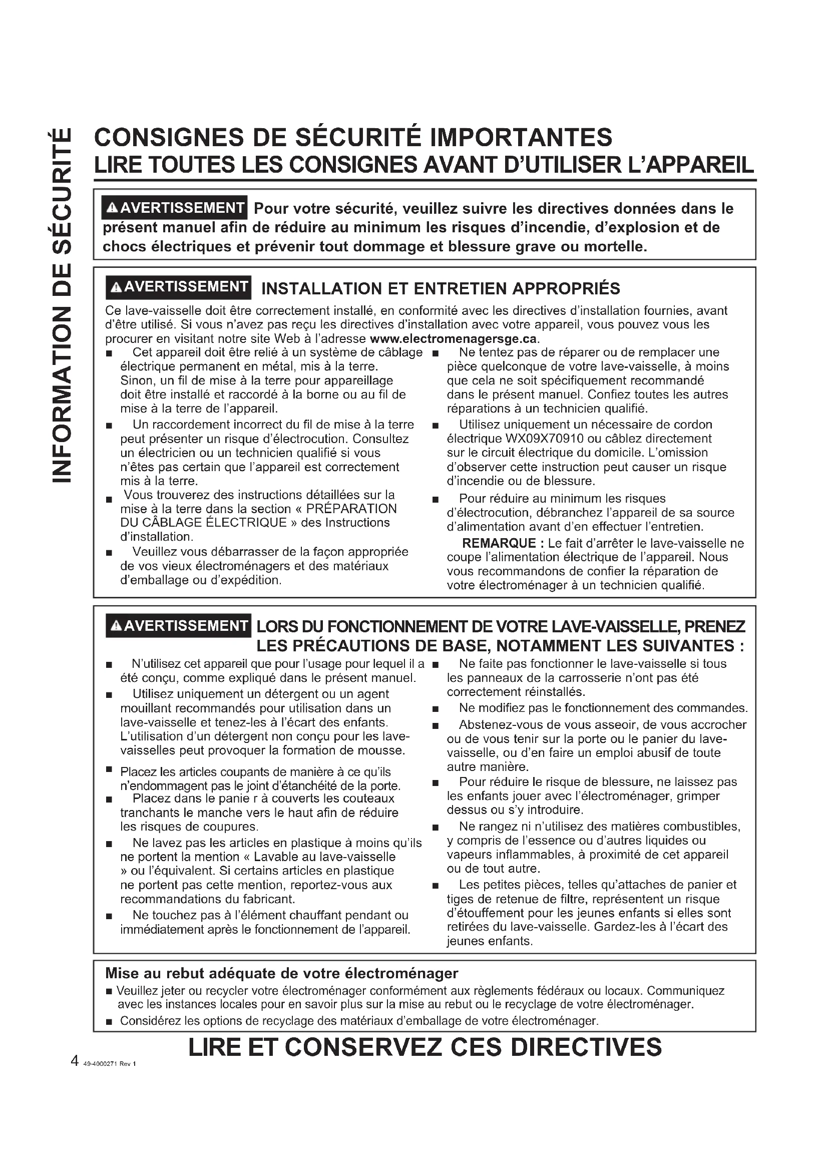 Ce lave-vaisselle doit être correctement installé, en conformité avec les directives d’installation fournies, avant d’être utilisé. Si vous n’avez pas reçu les directives d’installation avec votre appareil, vous pouvez vous les procurer en visitant notre site Web à l’adresse www.electromenagersge.ca. Ŷ &HWDSSDUHLOGRLWrWUHUHOLpjXQV\VWqPHGHFkEODJHélectrique permanent en métal, mis à la terre. Sinon, un fil de mise à la terre pour appareillage doit être installé et raccordé à la borne ou au fil de mise à la terre de l’appareil.Ŷ 8QUDFFRUGHPHQWLQFRUUHFWGXILOGHPLVHjODWHUUHpeut présenter un risque d’électrocution. Consultez un électricien ou un technicien qualifié si vous n’êtes pas certain que l’appareil est correctement mis à la terre. Vous trouverez des instructions détaillées sur la mise à la terre dans la section « PRÉPARATION '8&Æ%/$*(e/(&75,48(ªGHV,QVWUXFWLRQVd’installation.Ŷ 9HXLOOH]YRXVGpEDUUDVVHUGHODIDoRQDSSURSULpHde vos vieux électroménagers et des matériaux d’emballage ou d’expédition.Ŷ 1HWHQWH]SDVGHUpSDUHURXGHUHPSODFHUXQHpièce quelconque de votre lave-vaisselle, à moins que cela ne soit spécifiquement recommandé dans le présent manuel. Confiez toutes les autres réparations à un technicien qualifié.Ŷ 8WLOLVH]XQLTXHPHQWXQQpFHVVDLUHGHFRUGRQpOHFWULTXH:;;RXFkEOH]GLUHFWHPHQWVXUOHFLUFXLWpOHFWULTXHGXGRPLFLOH/¶RPLVVLRQd’observer cette instruction peut causer un risque d’incendie ou de blessure.Ŷ 3RXUUpGXLUHDXPLQLPXPOHVULVTXHVd’électrocution, débranchez l’appareil de sa source d’alimentation avant d’en effectuer l’entretien. REMARQUE :/HIDLWG¶DUUrWHUOHODYHYDLVVHOOHQHcoupe l’alimentation électrique de l’appareil. Nous vous recommandons de confier la réparation de votre électroménager à un technicien qualifié. AVERTISSEMENT LORS DU FONCTIONNEMENT DE VOTRE LAVE-VAISSELLE, PRENEZ LES PRÉCAUTIONS DE BASE, NOTAMMENT LES SUIVANTES : Ŷ 1¶XWLOLVH]FHWDSSDUHLOTXHSRXUO¶XVDJHSRXUOHTXHOLODété conçu, comme expliqué dans le présent manuel.Ŷ 8WLOLVH]XQLTXHPHQWXQGpWHUJHQWRXXQDJHQWmouillant recommandés pour utilisation dans un lave-vaisselle et tenez-les à l’écart des enfants. /¶XWLOLVDWLRQG¶XQGpWHUJHQWQRQFRQoXSRXUOHVODYHvaisselles peut provoquer la formation de mousse. Placez les articles coupants de manière à ce qu’ils n’endommagent pas le joint d’étanchéité de la porte.Ŷ 3ODFH]GDQVOHSDQLHUjFRXYHUWVOHVFRXWHDX[tranchants le manche vers le haut afin de réduire les risques de coupures.Ŷ 1HODYH]SDVOHVDUWLFOHVHQSODVWLTXHjPRLQVTX¶LOVQHSRUWHQWODPHQWLRQ©/DYDEOHDXODYHYDLVVHOOHªRXO¶pTXLYDOHQW6LFHUWDLQVDUWLFOHVHQSODVWLTXHne portent pas cette mention, reportez-vous aux recommandations du fabricant.Ŷ 1HWRXFKH]SDVjO¶pOpPHQWFKDXIIDQWSHQGDQWRXimmédiatement après le fonctionnement de l’appareil.Ŷ 1HIDLWHSDVIRQFWLRQQHUOHODYHYDLVVHOOHVLWRXVles panneaux de la carrosserie n’ont pas été correctement réinstallés.Ŷ 1HPRGLILH]SDVOHIRQFWLRQQHPHQWGHVFRPPDQGHVŶ $EVWHQH]YRXVGHYRXVDVVHRLUGHYRXVDFFURFKHUou de vous tenir sur la porte ou le panier du lave-vaisselle, ou d’en faire un emploi abusif de toute autre manière.Ŷ 3RXUUpGXLUHOHULVTXHGHEOHVVXUHQHODLVVH]SDVles enfants jouer avec l’électroménager, grimper GHVVXVRXV¶\LQWURGXLUHŶ 1HUDQJH]QLQ¶XWLOLVH]GHVPDWLqUHVFRPEXVWLEOHV\FRPSULVGHO¶HVVHQFHRXG¶DXWUHVOLTXLGHVRXvapeurs inflammables, à proximité de cet appareil ou de tout autre.Ŷ /HVSHWLWHVSLqFHVWHOOHVTX¶DWWDFKHVGHSDQLHUHWtiges de retenue de filtre, représentent un risque d’étouffement pour les jeunes enfants si elles sont UHWLUpHVGXODYHYDLVVHOOH*DUGH]OHVjO¶pFDUWGHVjeunes enfants. Mise au rebut adéquate de votre électroménager