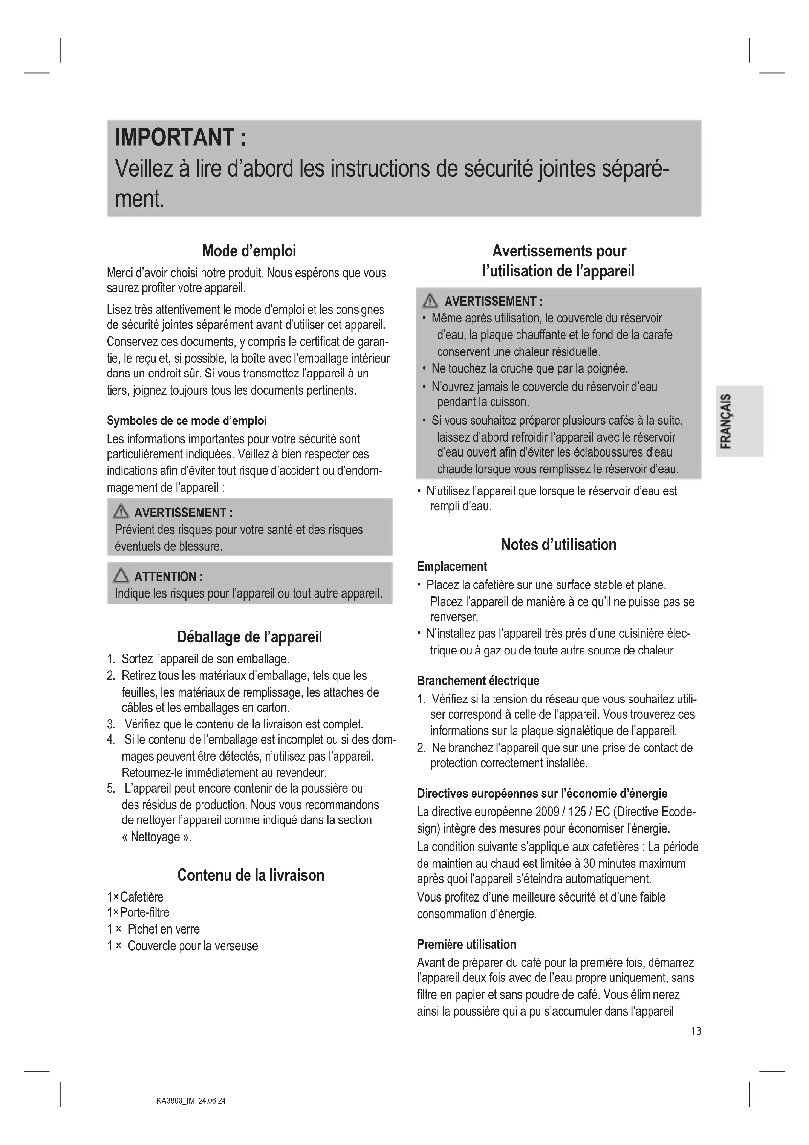 protection correctement installée. Directives européennes sur l’économie d’énergie La directive européenne 2009 / 125 / EC (Directive Ecode- sign) intègre des mesures pour économiser l’énergie. La condition suivante s’applique aux cafetières : La période de maintien au chaud est limitée à 30 minutes maximum après quoi l’appareil s’éteindra automatiquement. Vous profitez d’une meilleure sécurité et d’une faible consommation d’énergie. Première utilisation Avant de préparer du café pour la première fois, démarrez l’appareil deux fois avec de l’eau propre uniquement, sans filtre en papier et sans poudre de café. Vous éliminerez ainsi la poussière qui a pu s’accumuler dans l’appareilKA3808_IM 24.06.24