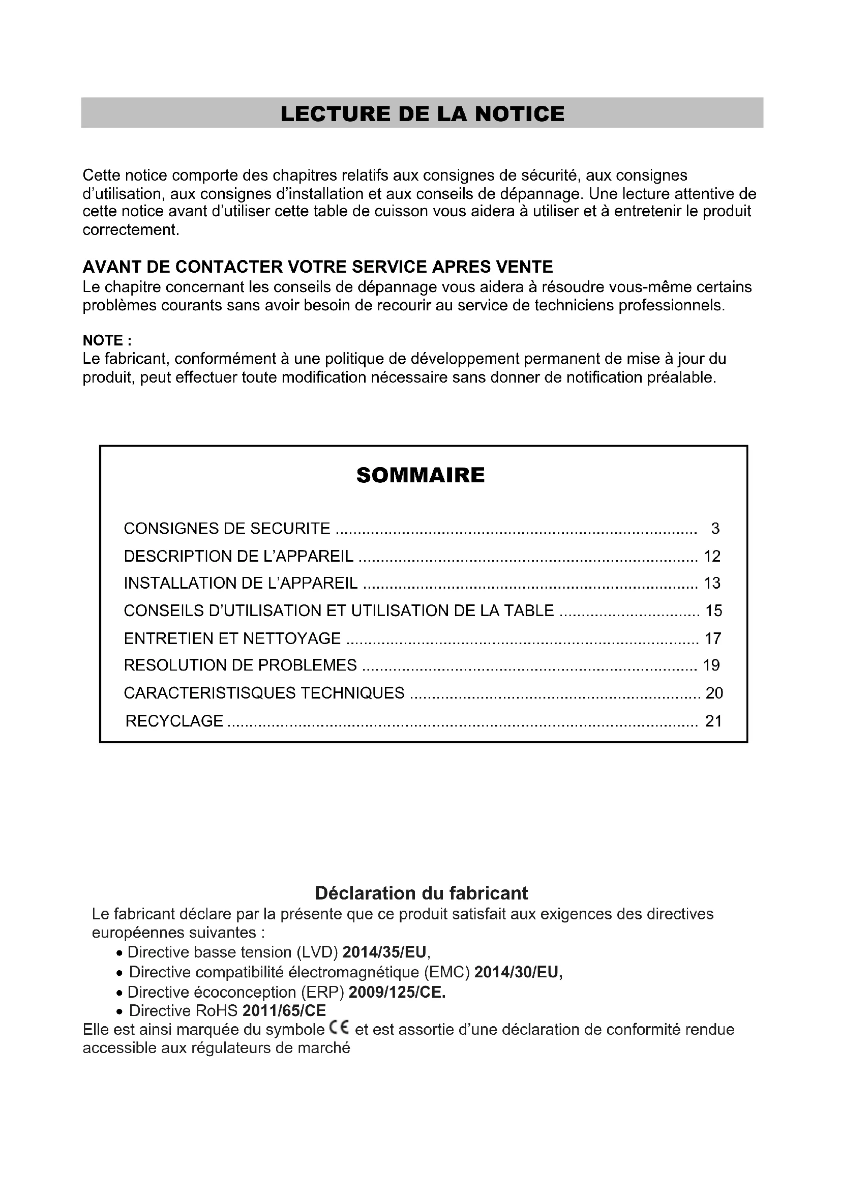 TableVitrocéramique Vitroceramischeplaat (03.2022/2.2)Cette notice comporte des chapitres relatifs aux consignes de sécurité, aux consignes d’utilisation, aux consignes d’installation et aux conseils de dépannage. Une lecture attentive de cette notice avant d’utiliser cette table de cuisson vous aidera à utiliser et à entretenir le produit correctement. AVANT DE CONTACTER VOTRE SERVICE APRES VENTE Le chapitre concernant les conseils de dépannage vous aidera à résoudre vous-même certains problèmes courants sans avoir besoin de recourir au service de techniciens professionnels. NOTE : Le fabricant, conformément à une politique de développement permanent de mise à jour du produit, peut effectuer toute modification nécessaire sans donner de notification préalable.