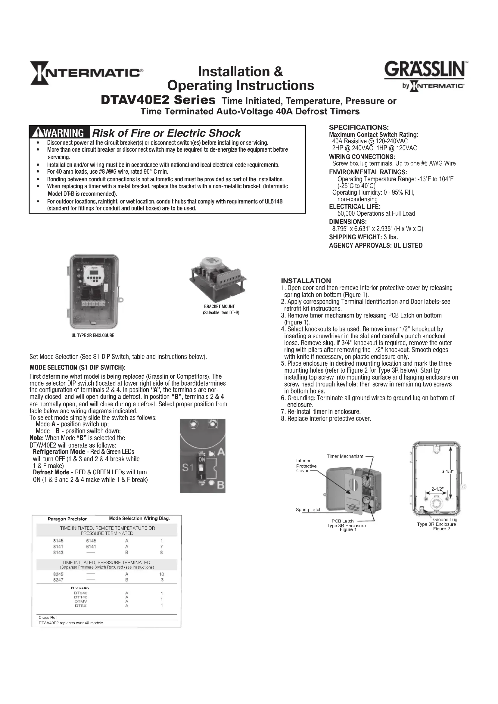 - Se deben usar ejes de conducto pluvífugos o para ubicaciones húmedas que cumplan los requisitos de la norma UL514B (estándar para piezas para conductos y cajas de distribución) en ubicaciones al aire libre. ADVERTENCIA Riesgo de incendio o descarga eléctricaInstructions d’installation et d’utilisation Série DTAV40E2 Minuterie de dégivrage 40 A à tension automatique, à déclenchement par horloge et interruption par température, pression ou horloge SÉLECTION DE MODE (COMMUTATEUR DIP S1): Déterminer d’abord quel modèle doit être remplacé (Grasslin ou autre marque). Le commutateur DIP de sélection de mode (sur le côté droit du circuit) détermine la configuration du contact entre les bornes 2 et 4. En position «A», ce contact est normalement fermé (contact repos) et s’ouvre durant un dégivrage. En position «B», le contact 2-4 est normalement ouvert (contact travail) et se ferme durant un dégivrage. Sélectionner la position qui convient depuis le tableau ci-dessous et les schémas de câblage indiqués. Pour sélectionner le mode, il suffit de coulisser le commutateur comme suit: Mode A - commutateur en position haute; Mode B - commutateur en position basse; Remarque: Si le mode B est sélectionné, la minuterie DTAV40E2 fonctionne comme suit: Mode réfrigération - Voyants rouge et vert éteints (contacts 1-3 et 2-4 ouverts, 1-F fermé) Mode dégivrage - Voyants rouge et vert allumés (contacts 1-3 et 2-4 fermés, 1-F ouvert) Figure 264 mm (2-1/2 po)156 mm (6-1/8 po)Cosse de terre INSTALLATION