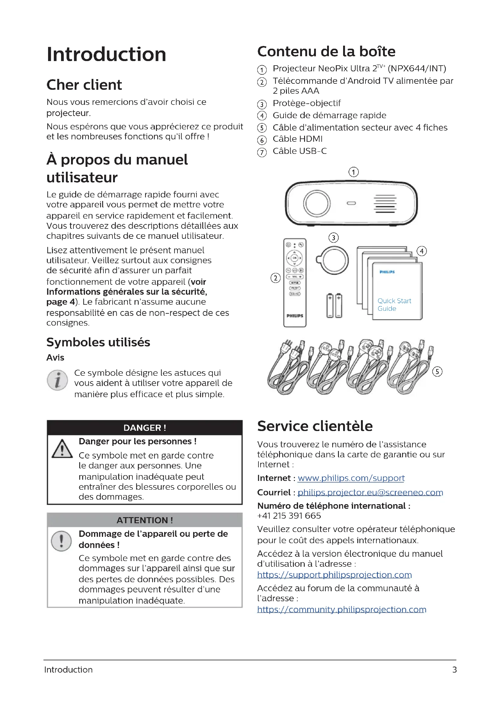 - Manuel utilisateur Enregistrez votre produit et obtenez de l’aide sur www.philips.com/support NeoPix Ultra 2 TV+ Home projectorIntroduction 3 Cher client p. 3