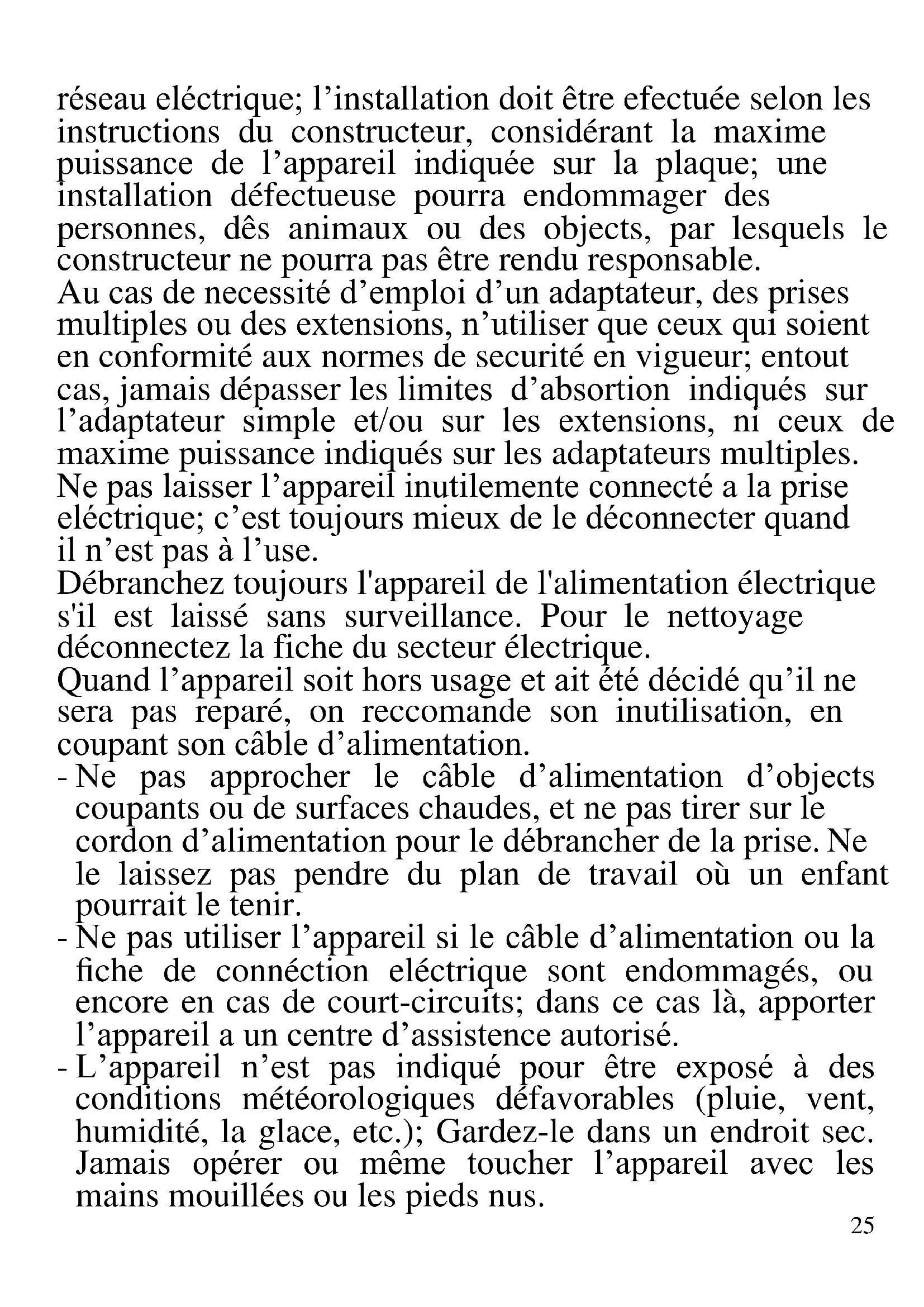 FRANCAIS: AVERTISSEMENT Les indications suivantes sont très importantes en ce qui concerne l’installation, usage et manutention de cet appareil; gardez soigneusement ce manuel pour des futures consultations; n’utilisez pas l’appareil que selon les indications de ce manuel d’instructions; n’importe quel autre type d’ utilisation devra être consideré inaproprié et potentiellement dangereux; pour cette raison le constructeur ne pourra pas être rendu responsable si des dommages résultants de l’utilisation inapropriée ou irresponsable de l’appareil se produisent. Avant de l’utilisation, certifiez-vous de l’integrité de l’appareil; en cas de doute ne l’utilisez pas et addressez- vous a l’assistence téchnique autoriséa; ne laissez pas des parties de l’emballage (sacs de plastique, polystirène, ongles, agrafages, etc.) à la portée des enfants, car elles constituent des potentielles sources de danger; en autre, il faut rappeler que ces parties doivent être objet de collècte differencié de résidus. Certifiez-vous que les donnés constants de la plaque sont compatibles avec ceux du25 réseau eléctrique; l’installation doit être efectuée selon les instructions du constructeur, considérant la maxime puissance de l’appareil indiquée sur la plaque; une installation défectueuse pourra endommager des personnes, dês animaux ou des objects, par lesquels le constructeur ne pourra pas être rendu responsable. Au cas de necessité d’emploi d’un adaptateur, des prises multiples ou des extensions, n’utiliser que ceux qui soient en conformité aux normes de securité en vigueur; entout cas, jamais dépasser les limites d’absortion indiqués sur l’adaptateur simple et/ou sur les extensions, ni ceux de maxime puissance indiqués sur les adaptateurs multiples. Ne pas laisser l’appareil inutilemente connecté a la prise eléctrique; c’est toujours mieux de le déconnecter quand il n’est pas à l’use. Débranchez toujours l'appareil de l'alimentation électrique s'il est laissé sans surveillance. Pour le nettoyage déconnectez la fiche du secteur électrique. Quand l’appareil soit hors usage et ait été décidé qu’il ne sera pas reparé, on reccomande son inutilisation, en coupant son câble d’alimentation. - Ne pas approcher le câble d’alimentation d’objects coupants ou de surfaces chaudes, et ne pas tirer sur le cordon d’alimentation pour le débrancher de la prise. Ne le laissez pas pendre du plan de travail où un enfant pourrait le tenir. - Ne pas utiliser l’appareil si le câble d’alimentation ou la fiche de connéction eléctrique sont endommagés, ou encore en cas de court-circuits; dans ce cas là, apporter l’appareil a un centre d’assistence autorisé. - L’appareil n’est pas indiqué pour être exposé à des conditions météorologiques défavorables (pluie, vent, humidité, la glace, etc.); Gardez-le dans un endroit sec. Jamais opérer ou même toucher l’appareil avec les mains mouillées ou les pieds nus.26 - Cet appareil peut être utilisé par des enfants agés de plus de 8 ans et par des personnes avec une réduite capacité phisique, sensorial ou mental, ou encore avec peu d’expérience à son usage, pourvu qu’une supervision adéquate leur en soit assuré, ou s’ils auraient été instruits à l’usage de l’appareil en complete securité. Les opérations de nettoyage e de manutention ne oivent pás être efectués par des enfants, sauf pour ceux qui sont agés de plus de 8 ans et sont supervisionés. - Les enfants ne doivent pas jouer avec cet appareil. - Gardez l’appareil et le câble d’alimentation hors la portée des enfants agés de moins de 8 ans. Si le câble d'alimentation est endommagé ou en cas de panne et / ou de dysfonctionnement, ne modifiez pas l'appareil. Toute réparation doit être effectuée par le fabricant ou par son service d'assistance technique ou, en tout cas, par une personne possédant une qualification similaire, afin d'éviter tout risque. Le non-respect de ce qui précède peut compromettre la sécurité de l'appareil et invalider les conditions de la garantie. ATTENTION: Cet appareil comporte une fonction de chauffage. Quelques surfaces, même si non la plaque elle même, pourront atteindre des températures élevées. Étant donné que la sensibilité à la température diffère de personne à personne, cet appareil devrà être usé avec PRUDENCE. Placez l’appareil sur des surfaces adéhrentes et préparées pour cet effet, et utilisez les mésures de protection contre la chaleur conseillées. - Cet appareil est destiné à être utilisé dans les ménages et des applications similaires: les cuisines du personnel dans les magasins, bureaux et autres environnements de travail, pour les clients dans les hôtels, motels et autres environnements de type résidentiel, de type lit et petit- déjeuner, hébergement. - N’utiliser que des accéssoires e pièces d’origine.27 - L’appareil n’est pas conçu pour être utilisé avec une minuterie extérieure ou une commande à distance. - Avant chaque utilisation, effectuez le cordon d'alimentation. Ne soumettez pas le produit à des chocs susceptibles de l'endommager. Tenir l’appareil à l’écart des environnements où il peut y avoir des gaz, vapeurs, des substances inflammables ou explosives.