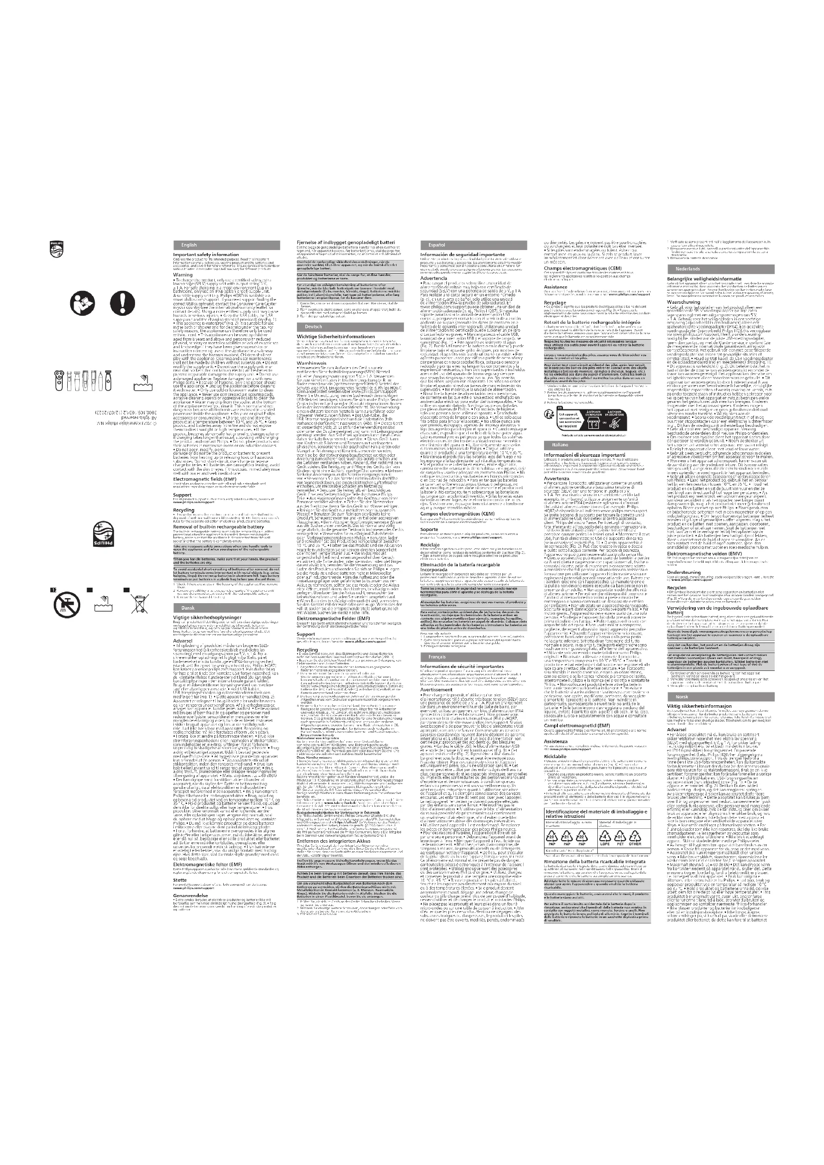 - Ce symbole signie que les produits électriques et les piles ne doivent pas être jetées avec les ordures ménagères (Fig. 3). •Respectez la réglementation de votre pays concernant la collecte sélective des produits électriques et des piles. Retrait de la batterie rechargeable intégrée La batterie rechargeable intégrée doit être retirée exclusivement par un professionnel qualié lors de la mise au rebut de l’appareil. Avant d’enlever la batterie, assurez-vous que l’appareil est débranché de la prise secteur et que la batterie est complètement vide. Respectez toutes les mesures de sécurité nécessaires lorsque vous utilisez des outils pour ouvrir l'appareil ou retirer la batterie rechargeable. Lorsque vous manipulez des piles, assurez-vous de bien sécher vos mains, le produit et les piles. Pour éviter tout court-circuit accidentel des piles après leur retrait, ne laissez pas les bornes des piles entrer en contact avec des objets métalliques (pièces de monnaie, épingles à cheveux, bagues, etc.). Ne les emballez pas dans du papier d’aluminium. Collez les bornes des piles avec du ruban adhésif ou mettez les piles dans un sac en plastique avant de les jeter. 1 Vériez si des vis sont présentes dans le boîtier de l’appareil. Si c'est le cas, enlevez-les. 2 Retirez les vis, panneaux ou pièces supplémentaires de l’appareil jusqu’à ce que le circuit imprimé et la batterie rechargeable soient visibles. 3 Retirez la batterie rechargeable. Points de collecte sur www.quefairedemesdechets.fr Cet appareil, son cordon et ses accessoires se recyclent Italiano Informazioni di sicurezza importanti Utilizzate il prodotto solo per lo scopo previsto. Prima di utilizzare il prodotto, le batterie e gli accessori, leggete attentamente queste informazioni importanti e conservatele per eventuali riferimenti futuri. L'uso improprio può causare pericoli o lesioni gravi. Gli accessori forniti potrebbero variare a seconda del prodotto. Avvertenza