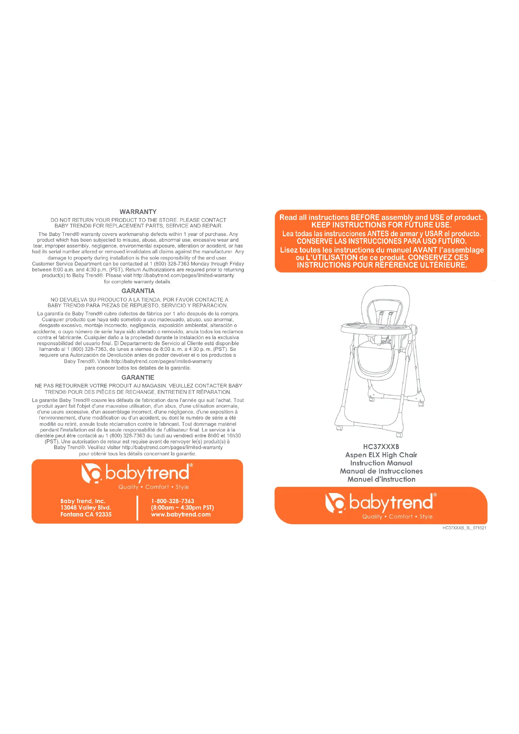 SERVICE CLIENT Le service client peut être contacté au 1 (800) 328-7363 du lundi au vendredi 8 h – 16 h 30 (PST). Une autorisation sera nécessaire avant de retourner le produit à Baby Trend®.
