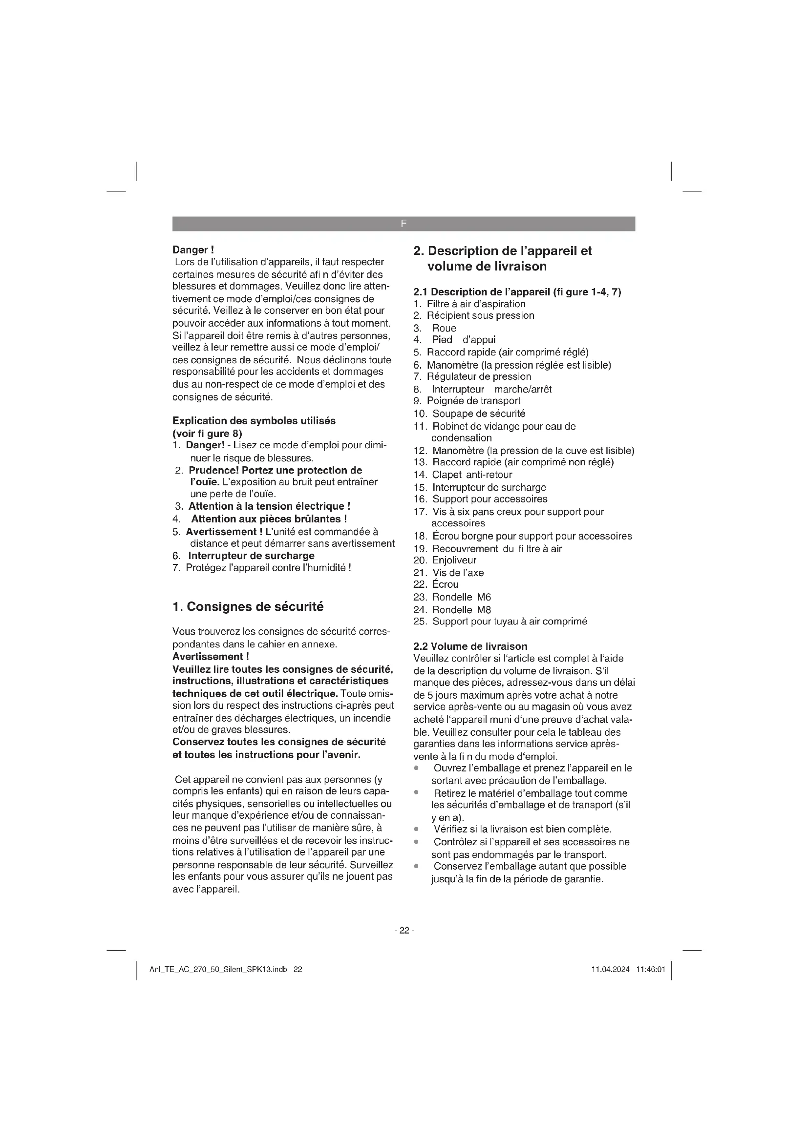 Débranche la fi che de contact, ventilez l'appareil et tous les outils pneumatiques raccordés. Rangez le comprésur de façon à ce qu'aucune personne non autorisée ne puisse lemettre en service.