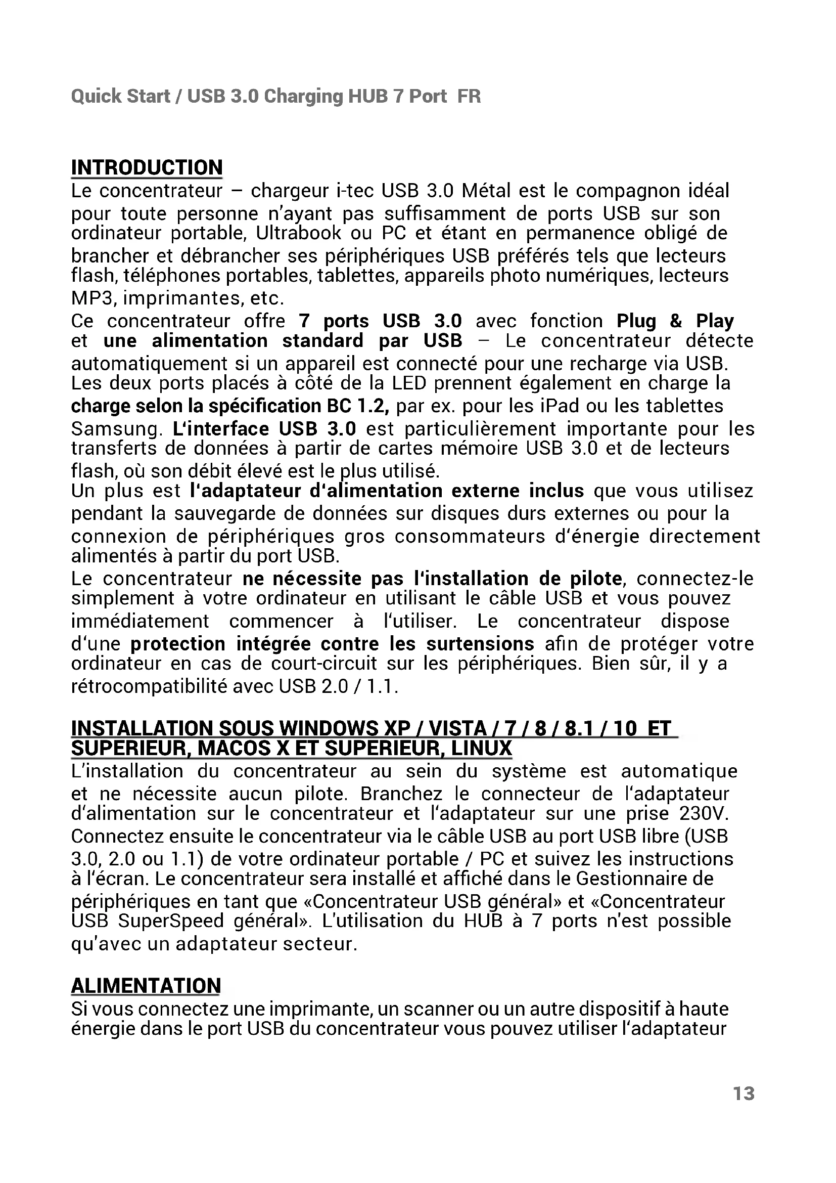 Verfügbar auf unserer Webseite www.i-tec.cz/de auf der Registerkarte “FAQ” dieses Produkts.13 Quick Start / USB 3.0 Charging HUB 7 Port FR INTRODUCTION Le concentrateur – chargeur i-tec USB 3.0 Métal est le compagnon idéal pour toute personne n’ayant pas susamment de ports USB sur son ordinateur portable, Ultrabook ou PC et étant en permanence obligé de brancher et débrancher ses périphériques USB préférés tels que lecteurs ash, téléphones portables, tablettes, appareils photo numériques, lecteurs MP3, imprimantes, etc. Ce concentrateur offre 7 ports USB 3.0 avec fonction Plug & Play et une alimentation standard par USB – Le concentrateur détecte automatiquement si un appareil est connecté pour une recharge via USB. Les deux ports placés à côté de la LED prennent également en charge la charge selon la spécication BC 1.2, par ex. pour les iPad ou les tablettes Samsung. L‘interface USB 3.0 est particulièrement importante pour les transferts de données à partir de cartes mémoire USB 3.0 et de lecteurs ash, où son débit élevé est le plus utilisé. Un plus est l‘adaptateur d‘alimentation externe inclus que vous utilisez pendant la sauvegarde de données sur disques durs externes ou pour la connexion de périphériques gros consommateurs d‘énergie directement alimentés à partir du port USB. Le concentrateur ne nécessite pas l‘installation de pilote, connectez-le simplement à votre ordinateur en utilisant le câble USB et vous pouvez immédiatement commencer à l‘utiliser. Le concentrateur dispose d‘une protection intégrée contre les surtensions an de protéger votre ordinateur en cas de court-circuit sur les périphériques. Bien sûr, il y a rétrocompatibilité avec USB 2.0 / 1.1.