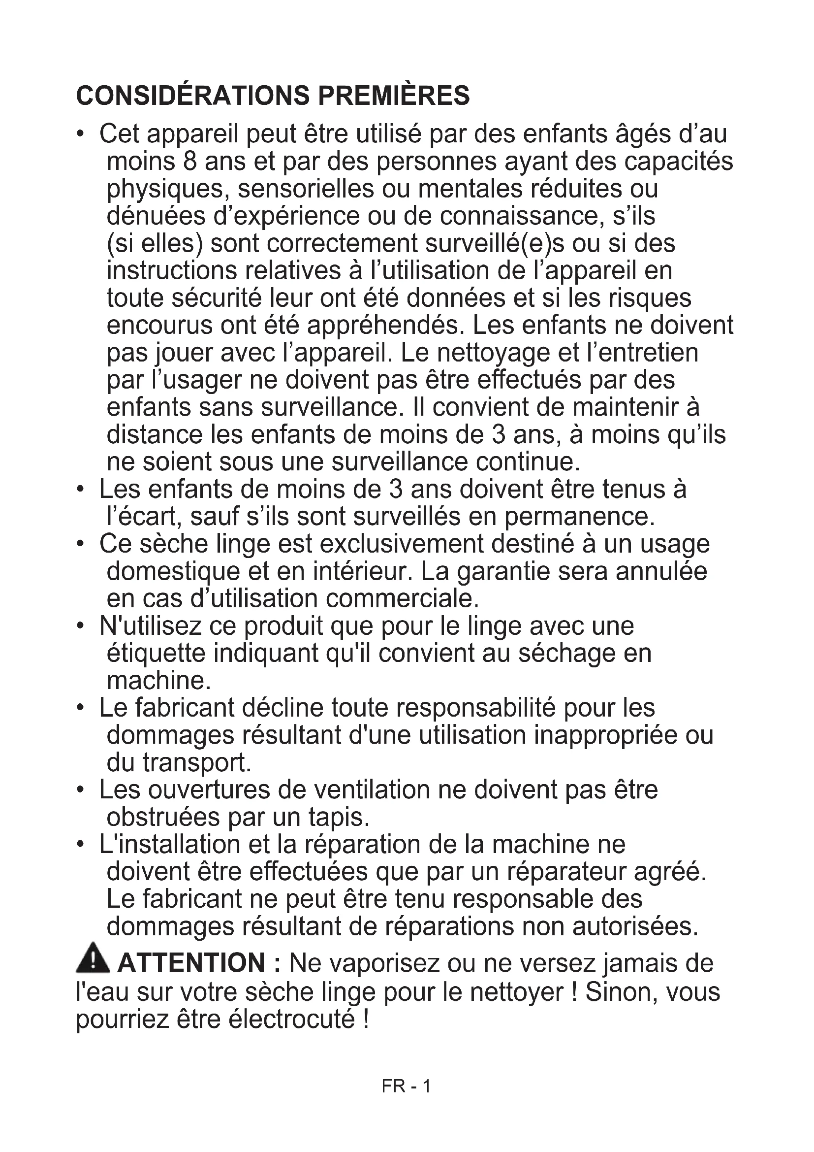 - L'installation et la réparation de la machine ne doivent être eectuées que par un réparateur agréé. Le fabricant ne peut être tenu responsable des dommages résultant de réparations non autorisées. ATTENTION : Ne vaporisez ou ne versez jamais de l'eau sur votre sèche linge pour le nettoyer ! Sinon, vous pourriez être électrocuté !FR - 2