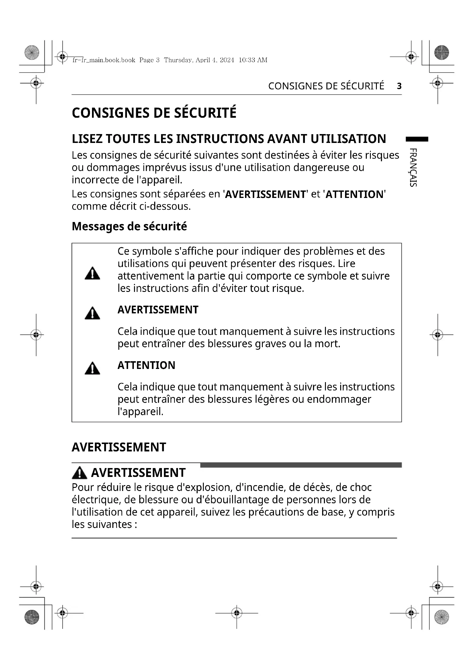 comme décrit ci-dessous. Messages de sécurité AVERTISSEMENT AVERTISSEMENT Pour réduire le risque d'explosion, d'incendie, de décès, de choc électrique, de blessure ou d'ébouillantage de personnes lors de l'utilisation de cet appareil, suivez les précautions de base, y compris les suivantes : Ce symbole s'affiche pour indiquer des problèmes et des utilisations qui peuvent présenter des risques. Lire attentivement la partie qui comporte ce symbole et suivre les instructions afin d'éviter tout risque. AVERTISSEMENT Cela indique que tout manquement à suivre les instructions peut entraîner des blessures graves ou la mort. ATTENTION Cela indique que tout manquement à suivre les instructions peut entraîner des blessures légères ou endommager l'appareil. fr-fr_main.book.book Page 3 Thursday, April 4, 2024 10:33 AM4