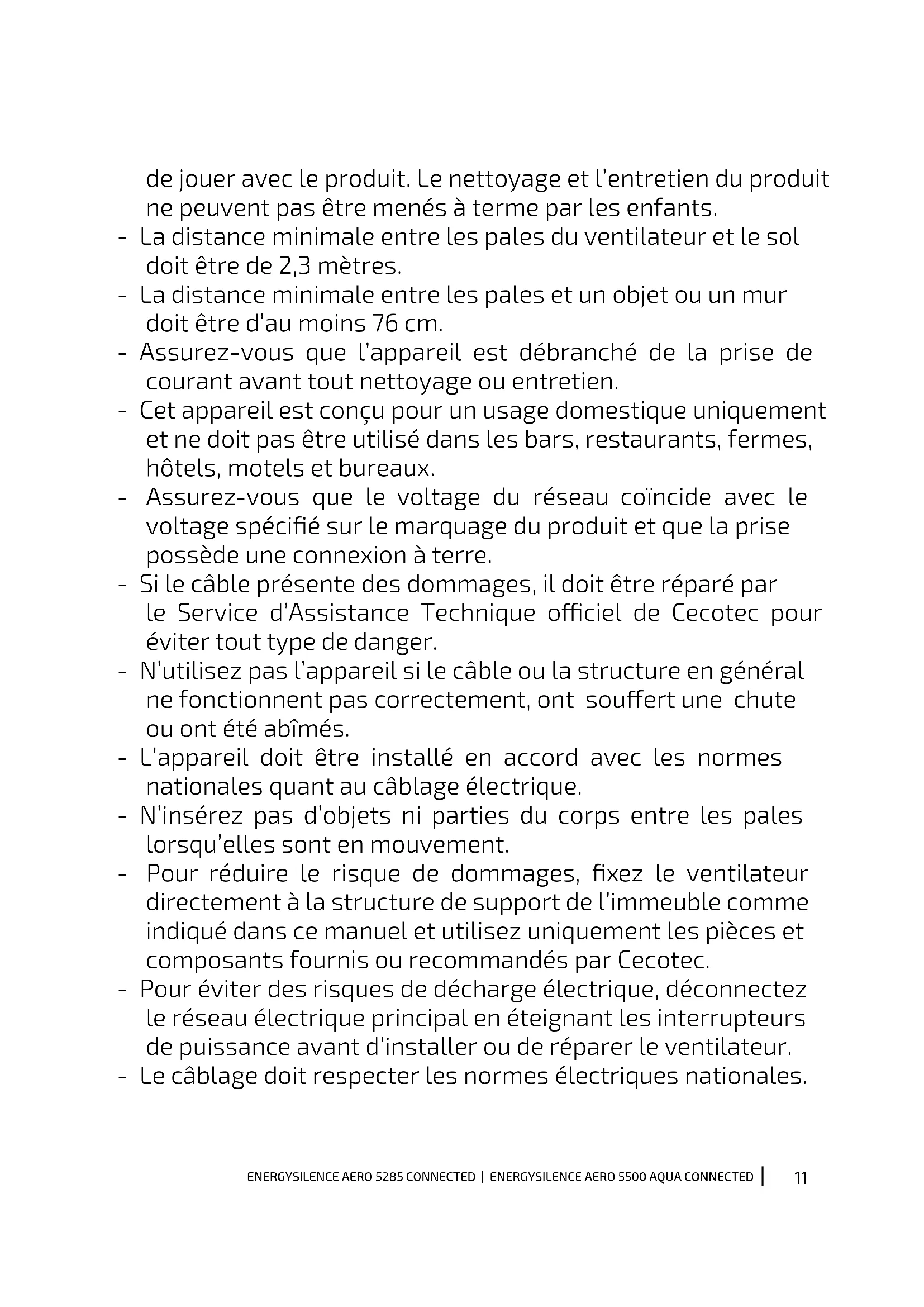 de jouer avec le produit. Le nettoyage et l’entretien du produit ne peuvent pas être menés à terme par les enfants. - La distance minimale entre les pales du ventilateur et le sol doit être de 2,3 mètres. - La distance minimale entre les pales et un objet ou un mur doit être d’au moins 76 cm. - Assurez-vous que l’appareil est débranché de la prise de courant avant tout nettoyage ou entretien. - Cet appareil est conçu pour un usage domestique uniquement et ne doit pas être utilisé dans les bars, restaurants, fermes, hôtels, motels et bureaux. - Assurez-vous que le voltage du réseau coïncide avec le voltage spécié sur le marquage du produit et que la prise possède une connexion à terre. - Si le câble présente des dommages, il doit être réparé par le Service d’Assistance Technique ociel de Cecotec pour éviter tout type de danger. - N’utilisez pas l’appareil si le câble ou la structure en général ne fonctionnent pas correctement, ont souert une chute ou ont été abîmés. - L’appareil doit être installé en accord avec les normes nationales quant au câblage électrique. - N’insérez pas d’objets ni parties du corps entre les pales lorsqu’elles sont en mouvement. - Pour réduire le risque de dommages, xez le ventilateur directement à la structure de support de l’immeuble comme indiqué dans ce manuel et utilisez uniquement les pièces et composants fournis ou recommandés par Cecotec. - Pour éviter des risques de décharge électrique, déconnectez le réseau électrique principal en éteignant les interrupteurs de puissance avant d’installer ou de réparer le ventilateur. - Le câblage doit respecter les normes électriques nationales.12 ENERGYSILENCE AERO 5285 CONNECTED | ENERGYSILENCE AERO 5500 AQUA CONNECTED - Le câble doit être correctement branché sur la prise de terre pour éviter de possibles accidents. - L’appareil doit être installé en accord avec les normes nationales quant au câblage électrique. - N’installez jamais le ventilateur dans une pièce où il y a beaucoup d’humidité. - Faites bien attention lorsque vous vous trouvez à côté des pales du ventilateur. - Pour contrôler la vitesse des pales du ventilateur, utilisez les moyens de contrôle de la vitesse fournis par Cecotec. - Ne pliez ni ne courbez le système de maintien des pales pendant l’installation ni pendant le nettoyage. - Pour assurer le correct fonctionnement de l’appareil, le nettoyage et l’entretien doivent être réalisés en accord avec ce manuel d’instructions. Éteignez et débranchez l’appareil avant de le nettoyer. - Assurez-vous que le ventilateur n’est pas placé près de rideaux ou d’autres objets qui puissent s’emmêler dans le ventilateur. - Maintenez tout le matériel composant l’emballage (sacs en plastique, boîtes, polystyrène, etc.) hors de portée des enfants an de garantir leur sécurité. - Il est recommandé que deux personnes réalisent le montage de cet appareil. - Ce produit est conçu pour une utilisation en intérieur. Instructions pour les piles - L’ingestion des piles peut provoquer des brûlures, la perforation des tissus mous et même la mort. L’ingestion de la batterie peut causer de graves brûlures dans les deux heures suivant l’ingestion. - En cas d’ingestion de piles, consultez immédiatement un médecin.ENERGYSILENCE AERO 5285 CONNECTED | ENERGYSILENCE AERO 5500 AQUA CONNECTED