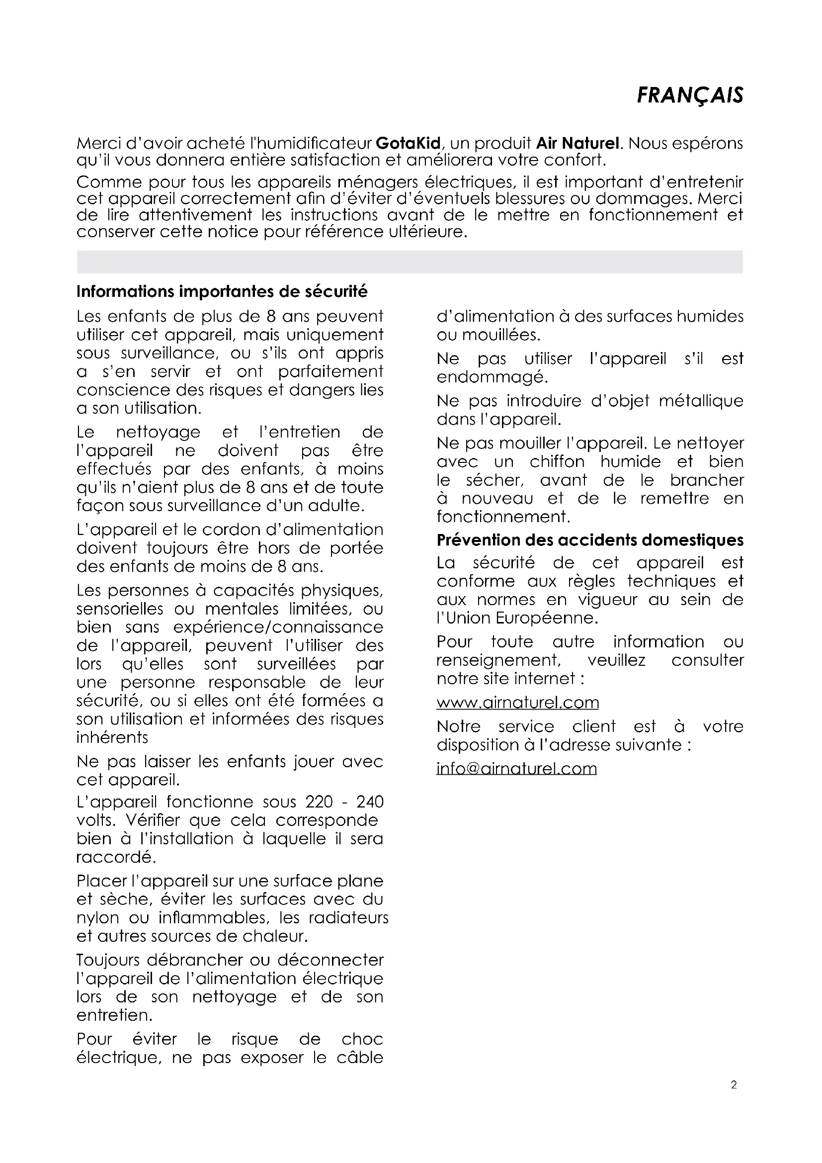 Notice d’utilisation User manual Bedienungsanleitung Manuale utente Manual de usuario www.airnaturel.comFRANÇAIS Les enfants de plus de 8 ans peuvent utiliser cet appareil, mais uniquement sous surveillance, ou s’ils ont appris a s’en servir et ont parfaitement conscience des risques et dangers lies a son utilisation. Le nettoyage et l’entretien de l’appareil ne doivent pas être effectués par des enfants, à moins qu’ils n’aient plus de 8 ans et de toute façon sous surveillance d’un adulte. L’appareil et le cordon d’alimentation doivent toujours être hors de portée des enfants de moins de 8 ans. Les personnes à capacités physiques, sensorielles ou mentales limitées, ou bien sans expérience/connaissance de l’appareil, peuvent l’utiliser des lors qu’elles sont surveillées par une personne responsable de leur sécurité, ou si elles ont été formées a son utilisation et informées des risques inhérents Ne pas laisser les enfants jouer avec cet appareil. L’appareil fonctionne sous 220 - 240 volts. Vérier que cela corresponde bien à l’installation à laquelle il sera raccordé. Placer l’appareil sur une surface plane et sèche, éviter les surfaces avec du nylon ou inammables, les radiateurs et autres sources de chaleur. Toujours débrancher ou déconnecter l’appareil de l’alimentation électrique lors de son nettoyage et de son entretien. Pour éviter le risque de choc électrique, ne pas exposer le câble d’alimentation à des surfaces humides ou mouillées. Ne pas utiliser l’appareil s’il est endommagé. Ne pas introduire d’objet métallique dans l’appareil. Ne pas mouiller l’appareil. Le nettoyer avec un chiffon humide et bien le sécher, avant de le brancher à nouveau et de le remettre en fonctionnement. Prévention des accidents domestiques La sécurité de cet appareil est conforme aux règles techniques et aux normes en vigueur au sein de l’Union Européenne. Pour toute autre information ou renseignement, veuillez consulter notre site internet : www.airnaturel.com Notre service client est à votre disposition à l’adresse suivante : info@airnaturel.com Merci d’avoir acheté l'humidicateur GotaKid, un produit Air Naturel. Nous espérons qu’il vous donnera entière satisfaction et améliorera votre confort. Comme pour tous les appareils ménagers électriques, il est important d’entretenir cet appareil correctement an d’éviter d’éventuels blessures ou dommages. Merci de lire attentivement les instructions avant de le mettre en fonctionnement et conserver cette notice pour référence ultérieure. Informations importantes de sécurité 2Caractéristiques Alimentation 220 - 240 V ~ 50 Hz Humidication 350 mL/h Dimensions du produit 404 x 230 x 230 mm (H x L x P) Poids net 1,57 kg Consommation 30 W Capacité du réservoir 3 L Zone d’efcacité max. 30 m² Niveau sonore ≤ 35 dB Contrôle électronique du taux d’humidité par hygrostat électronique Fonction HygroSmart