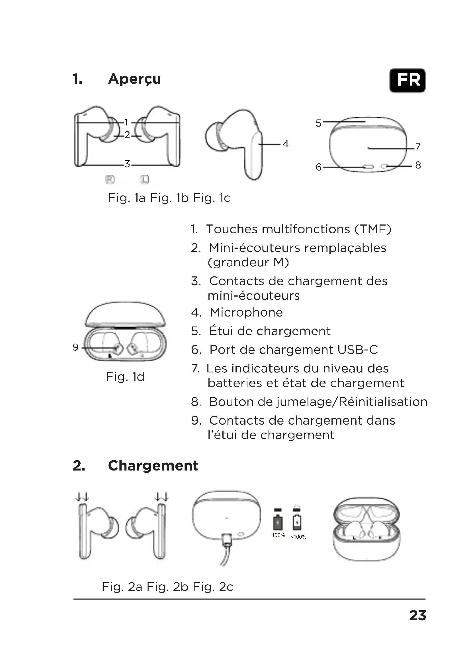 - Fig. 2c : Placez les écouteurs dans l’étui de chargement et fermez le couvercle pour commencer le chargement. Lorsque vous mettez les Oreillettes d’écoute dans l’étui de chargement, vous verrez un des scénarios suivants : État DEL L’étui de chargement est fermé L’Étui de chargement est ouvert Clignote bleu Les Oreillettes d’écoute chargent