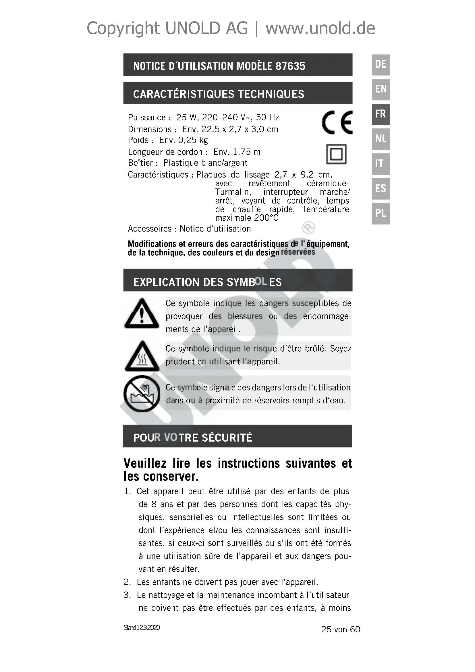 remplacé par le fabricant, son service après-vente ou par une personne qualifiée afin d’éviter tous risques. Attention ! L‘appareil est très chaud pendant et après le fonctionnement ! Tenir les enfants à distance ! N’ouvrez en aucun cas la coque de l’appareil. Risque d‘électrocution. Pour des raisons de sécurité, n’utilisez jamais l‘appareil à proximité d’une baignoire pleine, d’un lavabo ou tout autre récipient rempli d‘eau. Si le fer à lisser est utilisé dans une salle de bain, la prise doit être débranchée après chaque utilisation. En effet, l‘eau représente un danger dans le cas contraire, et ce même si le fer à lisser est éteint. Copyright UNOLD AG | www.unold.deDE