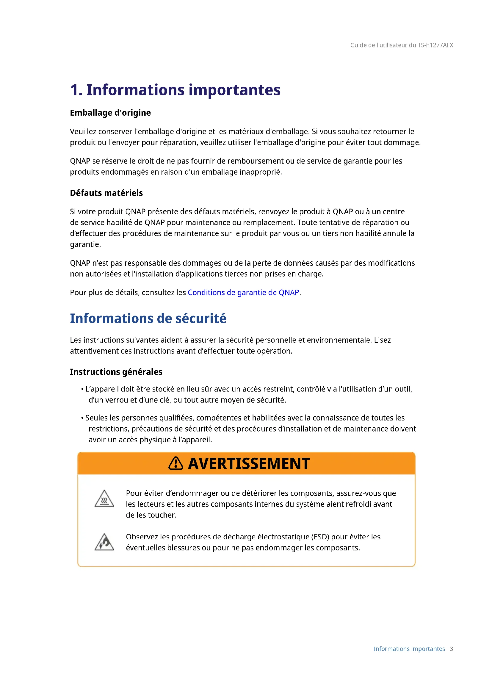 Emballage d'origine Veuillez conserver l'emballage d'origine et les matériaux d'emballage. Si vous souhaitez retourner le produit ou l'envoyer pour réparation, veuillez utiliser l'emballage d'origine pour éviter tout dommage. QNAP se réserve le droit de ne pas fournir de remboursement ou de service de garantie pour les produits endommagés en raison d'un emballage inapproprié. Défauts matériels Si votre produit QNAP présente des défauts matériels, renvoyez le produit à QNAP ou à un centre de service habilité de QNAP pour maintenance ou remplacement. Toute tentative de réparation ou d’eectuer des procédures de maintenance sur le produit par vous ou un tiers non habilité annule la garantie. QNAP n’est pas responsable des dommages ou de la perte de données causés par des modications non autorisées et l’installation d’applications tierces non prises en charge. Pour plus de détails, consultez les Conditions de garantie de QNAP. Informations de sécurité Les instructions suivantes aident à assurer la sécurité personnelle et environnementale. Lisez attentivement ces instructions avant d’eectuer toute opération. Instructions générales