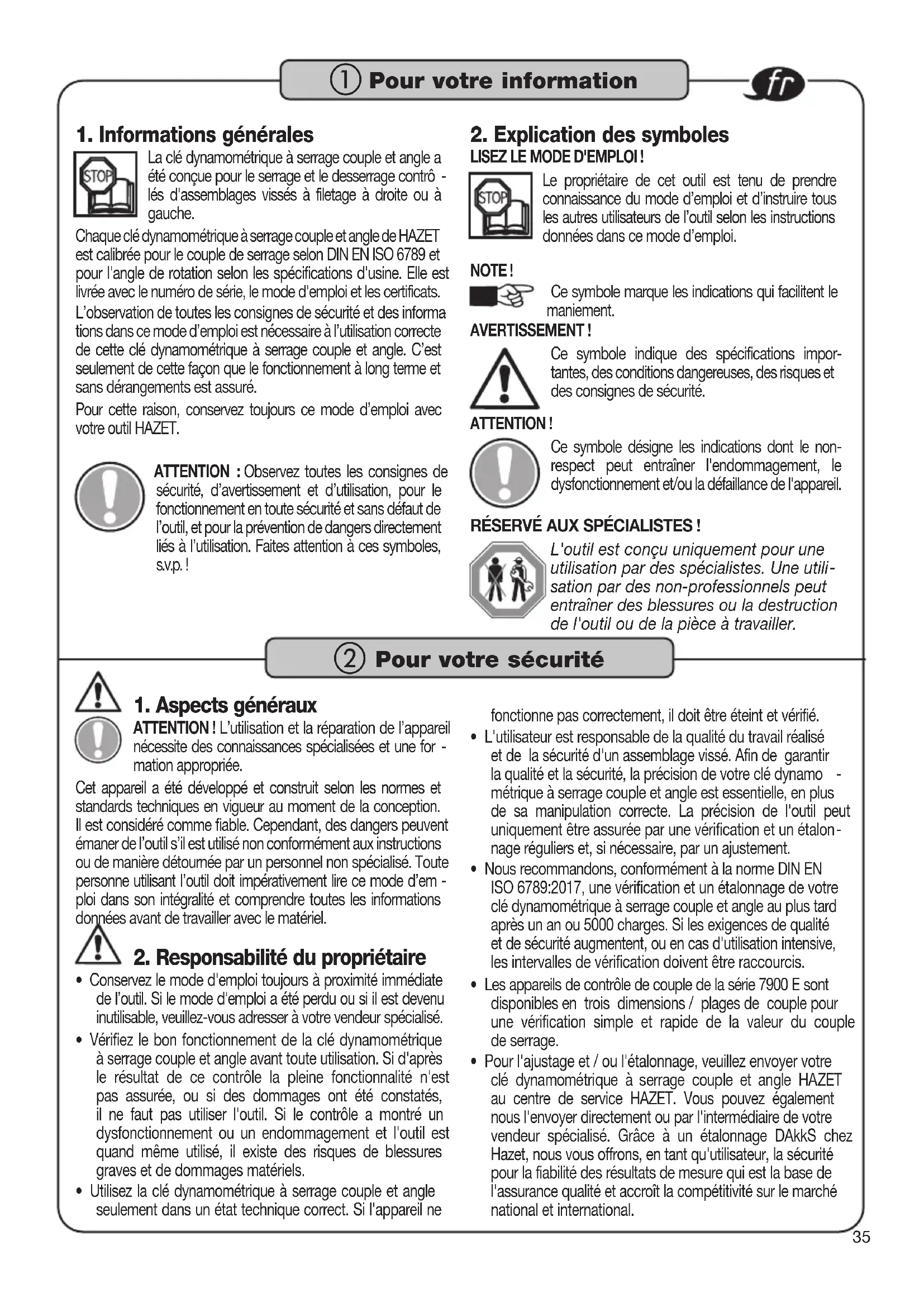 tions dans ce mode d’emploi est nécessaire à l’utilisation correcte de cette clé dynamométrique à serrage couple et angle. C’est seulement de cette façon que le fonctionnement à long terme et sans dérangements est assuré. Pour cette raison, conservez toujours ce mode d’emploi avec votre outil HAZET. ATTENTION : Observez toutes les consignes de sécurité, d’avertissement et d’utilisation, pour le fonctionnement en toute sécurité et sans défaut de l’outil, et pour la prévention de dangers directement liés à l’utilisation. Faites attention à ces symboles, s.v.p. !