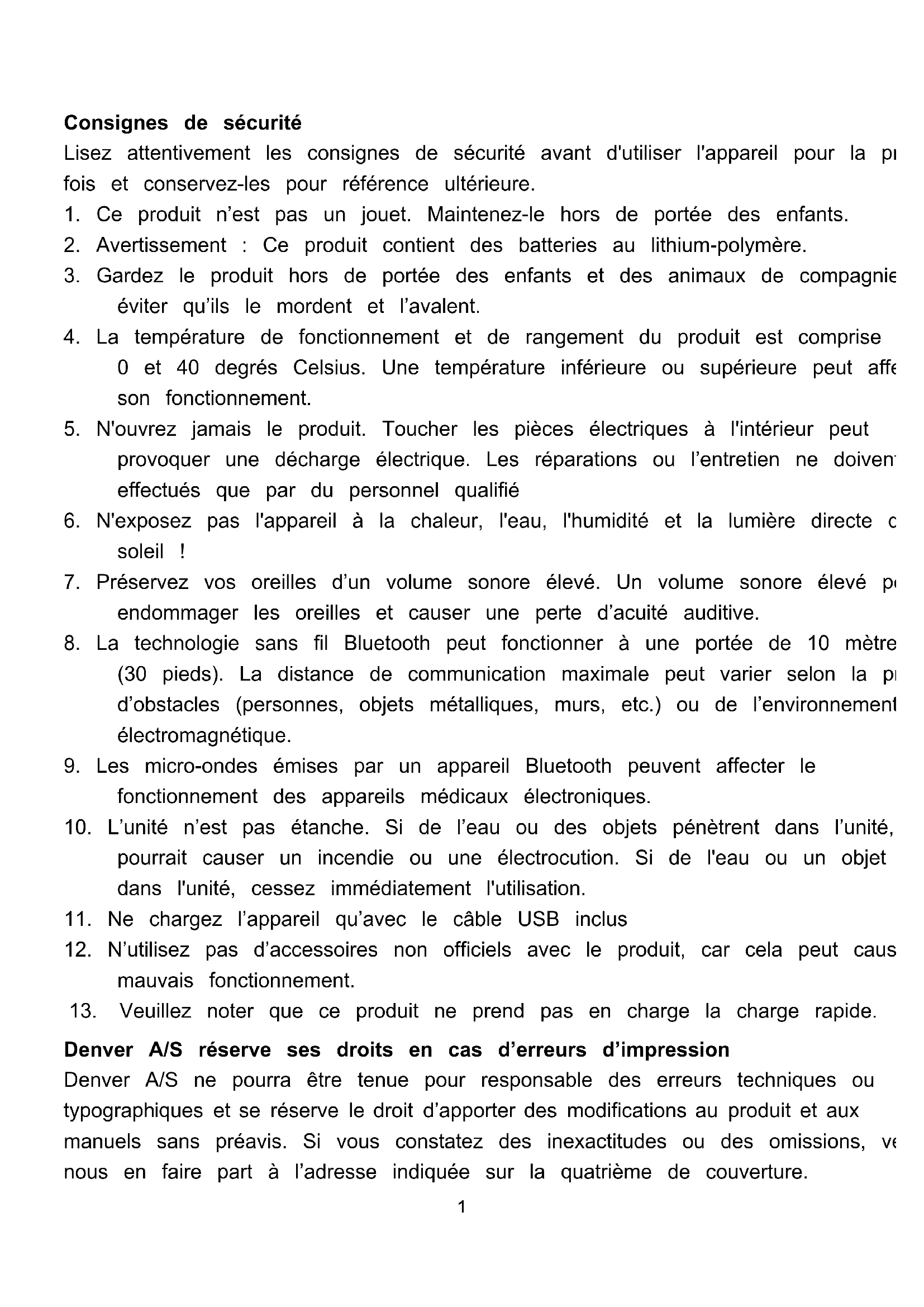 mauvais fonctionnement. Denver A/S réserve ses droits en cas d’erreurs d’impression Denver A/S ne pourra être tenue pour responsable des erreurs techniques ou typographiques et se réserve le droit d’apporter des modifications au produit et aux manuels sans préavis. Si vous constatez des inexactitudes ou des omissions, veuillez nous en faire part à l’adresse indiquée sur la quatrième de couverture.