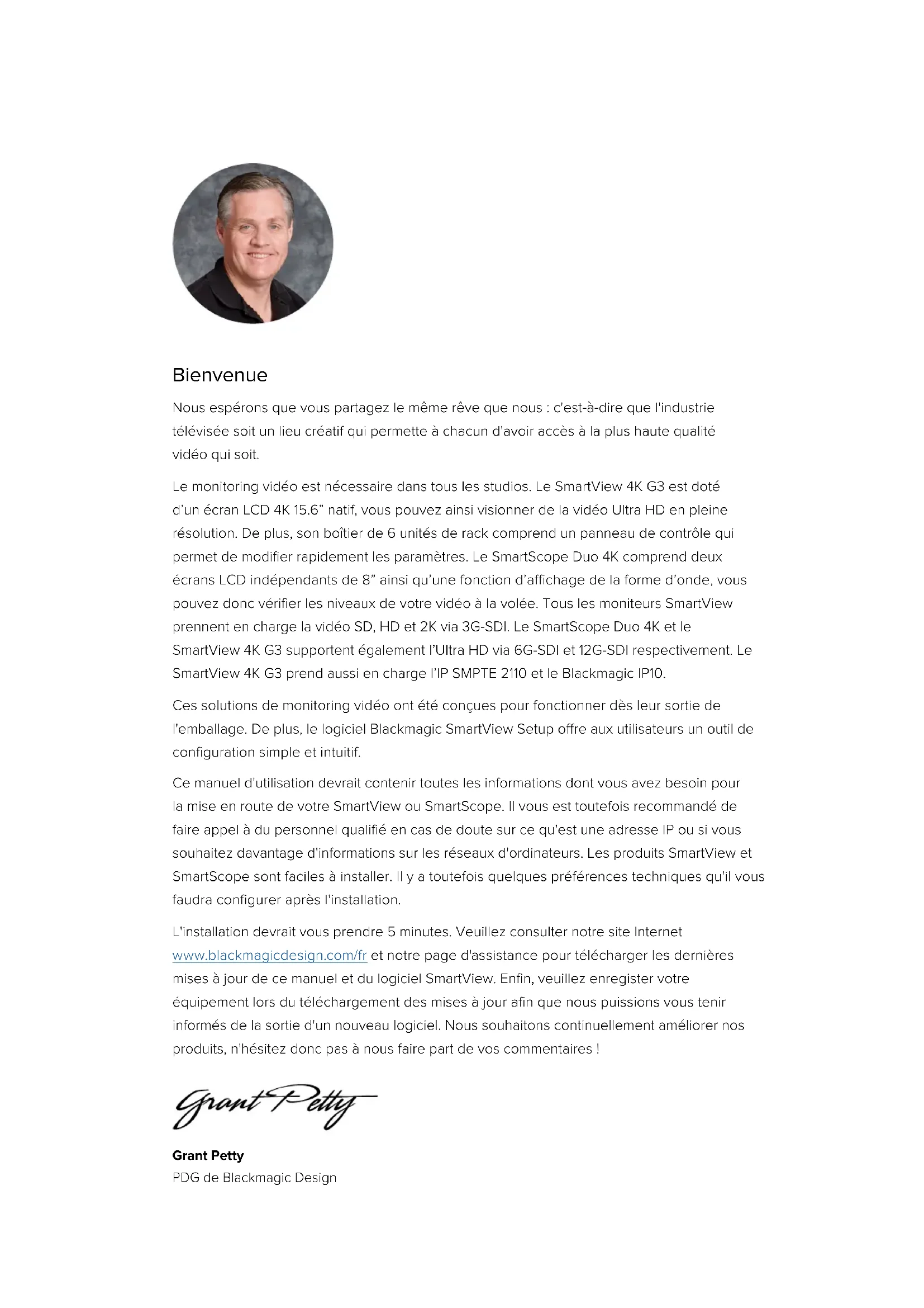 保証Français SmartView 4K G3 SmartView Duo SmartScope Duo 4K Juillet 2024 Manuel d'installation et d’utilisation Blackmagic SmartView SmartScopeBienvenue Nous espérons que vous partagez le même rêve que nous : c'est-à-dire que l'industrie télévisée soit un lieu créatif qui permette à chacun d'avoir accès à la plus haute qualité vidéo qui soit. Le monitoring vidéo est nécessaire dans tous les studios. Le SmartView 4K G3 est doté d’un écran LCD 4K 15.6” natif, vous pouvez ainsi visionner de la vidéo Ultra HD en pleine résolution. De plus, son boîtier de 6 unités de rack comprend un panneau de contrôle qui permet de modifier rapidement les paramètres. Le SmartScope Duo 4K comprend deux écrans LCD indépendants de 8” ainsi qu’une fonction d’affichage de la forme d’onde, vous pouvez donc vérifier les niveaux de votre vidéo à la volée. Tous les moniteurs SmartView prennent en charge la vidéo SD, HD et 2K via 3G-SDI. Le SmartScope Duo 4K et le SmartView 4K G3 supportent également l’Ultra HD via 6G-SDI et 12G-SDI respectivement. Le SmartView 4K G3 prend aussi en charge l’IP SMPTE 2110 et le Blackmagic IP10. Ces solutions de monitoring vidéo ont été conçues pour fonctionner dès leur sortie de l'emballage. De plus, le logiciel Blackmagic SmartView Setup offre aux utilisateurs un outil de configuration simple et intuitif. Ce manuel d'utilisation devrait contenir toutes les informations dont vous avez besoin pour la mise en route de votre SmartView ou SmartScope. Il vous est toutefois recommandé de faire appel à du personnel qualifié en cas de doute sur ce qu'est une adresse IP ou si vous souhaitez davantage d'informations sur les réseaux d'ordinateurs. Les produits SmartView et SmartScope sont faciles à installer. Il y a toutefois quelques préférences techniques qu'il vous faudra configurer après l'installation. L'installation devrait vous prendre 5 minutes. Veuillez consulter notre site Internet www.blackmagicdesign.com/fr et notre page d'assistance pour télécharger les dernières mises à jour de ce manuel et du logiciel SmartView. Enfin, veuillez enregister votre équipement lors du téléchargement des mises à jour afin que nous puissions vous tenir informés de la sortie d'un nouveau logiciel. Nous souhaitons continuellement améliorer nos produits, n'hésitez donc pas à nous faire part de vos commentaires ! Grant Petty PDG de Blackmagic DesignContenu SmartView & SmartScope Mise en route 93 Découverte du SmartView et du SmartScope 93 Connecter des sources vidéo 94 Connecter un ordinateur 95 Utiliser le Blackmagic SmartView Setup 96 Installer le Blackmagic SmartView Setup 96 Mettre à jour le logiciel 97 Utiliser le SmartView 4K G3 98 Boutons du panneau de contrôle 99 Codec vidéo Blackmagic IP10 101 Modifier les réglages via le SmartView Setup 102 Onglet Setup (réglages) 102 Onglet 2110 105 Onglet LUTs 107 SmartView et SmartScope Duo 4K 108 Ajuster les paramètres du moniteur 108 Case Enable tally override 110 Utiliser SmartScope Duo 4K 110 Qu’est-ce que le Blackmagic SmartScope ? 110 Achage Video Monitoring 111 Achage Waveform 112 Achage Vectorscope 113 Achages Parade 114 Achage Histogram 116 Achages des niveaux audio 117 Paramètres réseau 118 Se connecter à un réseau 119 Connexion Ethernet directe 119 Commutateur réseau Ethernet 120 Utiliser le tally 121 Broches du port tally 121 Optimiser l’angle de vision 122 Developer Information 124 Blackmagic 2K Format – Overview 124 Blackmagic 2K Format – Vertical Timing Reference 125 Blackmagic 2K Format – Data Stream Format 125 Blackmagic SmartView Ethernet Protocol v1.4 126 Assistance 130 Avertissements 131 Informations de sécurité 132 Garantie 133Mise en route Découverte du SmartView et du SmartScope Les moniteurs SmartView sont des outils de choix pour les studios qui ont besoin d’une solution de monitoring sur rack. Pour les mettre en route, il suffit de les brancher à une source d'alimentation et de connecter une source SDI ! Le SmartView 4K G3 possède un écran LCD 4K de 15,6 pouces, vous pouvez donc afficher de la vidéo SD, HD ou Ultra HD dans sa résolution native de 3840x2160. Les boutons situés sur la face avant de l’appareil vous permettent de sélectionner facilement les entrées, d’ajuster la luminosité de l’écran, de vérifier s’il y a du bruit dans le canal bleu, d’afficher les informations de blanking, d’appliquer des LUTs 3D et autres. Le SmartView Duo dispose de deux moniteurs pour afficher simultanément différents signaux vidéo SD et HD. Vous pouvez par exemple afficher un signal YUV 4:2:2 sur le premier moniteur et un signal RVB 4:4:4 sur le deuxième, ou encore un signal NTSC sur un moniteur et un signal PAL sur l’autre. Réalisez de nombreuses combinaisons, en connectant simplement un câble SDI à chaque moniteur ! Le SmartScope Duo 4K intègre les mêmes fonctionnalités que le SmartView Duo, mais il permet également d’afficher la forme d’onde, le vecteurscope et d’autres scopes populaires pour le monitoring de la vidéo et de l’audio en temps réel. De plus, vous disposez d’une prise en charge intégrale de l’Ultra HD! Toutes les entrées SDI des moniteurs SmartView et SmartScope supportent la détection automatique de la SD, de la HD ou du 3G-SDI, y compris la vidéo 2K. Le SmartView 4K G3 détecte également l’Ultra HD via 12G-SDI, notamment les formats tels que 2160p60. Le SmartScope Duo 4K, quant à lui, détecte automatiquement la vidéo Ultra HD via 6G-SDI. Le SmartView 4K G3 comprend également l’IP 2110 10G pour recevoir la vidéo IP SMPTE 2110 jusqu’en Ultra HD 2160p60 avec le Blackmagic IP10. Si vous souhaitez ajuster à distance les paramètres de plusieurs appareils SmartView et SmartScope à partir d’un ordinateur, vous pouvez les relier ensemble via Ethernet. Ainsi, vous n’aurez pas besoin de brancher un ordinateur à chaque appareil via USB à chaque fois que vous devez ajus