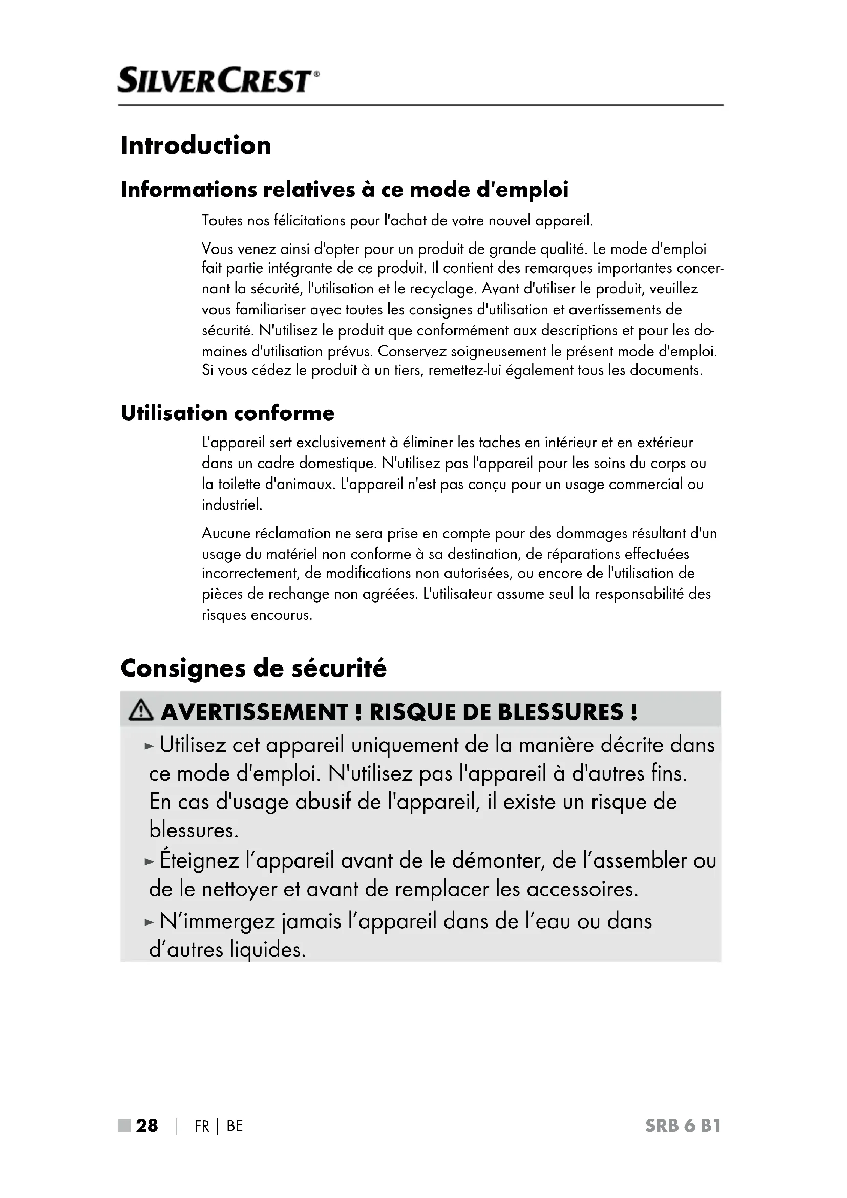 SRB 6 B1 Introduction Informations relatives à ce mode d'emploi Toutes nos félicitations pour l'achat de votre nouvel appareil. Vous venez ainsi d'opter pour un produit de grande qualité. Le mode d'emploi fait partie intégrante de ce produit. Il contient des remarques importantes concer- nant la sécurité, l'utilisation et le recyclage. Avant d'utiliser le produit, veuillez vous familiariser avec toutes les consignes d'utilisation et avertissements de sécurité. N'utilisez le produit que conformément aux descriptions et pour les do- maines d'utilisation prévus. Conservez soigneusement le présent mode d'emploi. Si vous cédez le produit à un tiers, remettez-lui également tous les documents. Utilisation conforme L'appareil sert exclusivement à éliminer les taches en intérieur et en extérieur dans un cadre domestique. N'utilisez pas l'appareil pour les soins du corps ou la toilette d'animaux. L'appareil n'est pas conçu pour un usage commercial ou industriel. Aucune réclamation ne sera prise en compte pour des dommages résultant d'un usage du matériel non conforme à sa destination, de réparations effectuées incorrectement, de modifications non autorisées, ou encore de l'utilisation de pièces de rechange non agréées. L'utilisateur assume seul la responsabilité des risques encourus. Consignes de sécurité AVERTISSEMENT! RISQUE DE BLESSURES! ► Utilisez cet appareil uniquement de la manière décrite dans ce mode d'emploi. N'utilisez pas l'appareil à d'autres fins. En cas d'usage abusif de l'appareil, il existe un risque de blessures. ► Éteignez l’appareil avant de le démonter, de l’assembler ou de le nettoyer et avant de remplacer les accessoires. ► N’immergez jamais l’appareil dans de l’eau ou dans d’autres liquides.FR