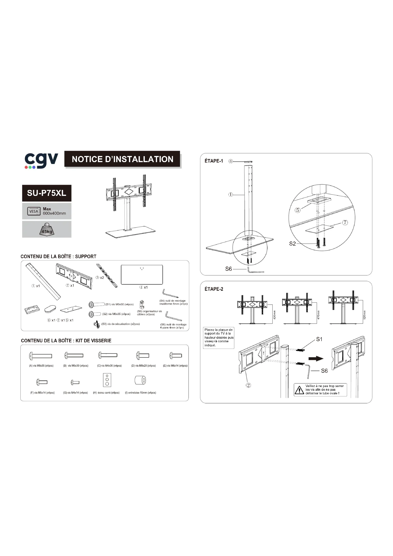 - N’essayez pas d’installer ce pied TV si vous n’êtes pas en mesure d’appliquer les directives, ou si vous avez un doute au sujet des consignes de sécurité ou des instructions de montage. Dans ce cas, vous pouvez contacter notre Hotline, aller sur notre site www.cgv.fr ou contacter un professionnel.• N'employez jamais des pièces défectueuses ou non adaptées. Une mauvaise installation peut causer des dommages sérieux.• N'employez pas ce produit dans un autre but que celui pour lequel il est conçu.• CGV ne peut être tenu pour responsable des dommages provoqués par un montage incorrect, une mauvaise utilisation ou un non respect des instructions de montage et des consignes de sécurité. • Si vous êtes incertain des dimensions de votre TV, consultez un expert. Consultez un professionnel pour monter votre support TV, en cas de besoin.• Le matériel de fixation joint convient exclusivement à votre modèle de support TV.• Assurez-vous que l'ensemble du pied TV soit placé sur une surface plane, suffisamment grande et résistante pour supporter la structure.• Ce pied est conçu pour être utilisé exclusivement en intérieur. SAV et Garantie Malgré le soin que nous avons apporté à la conception de nos produits et à la réalisation de cette notice, vous avez peut-être rencontré des difficultés. N’hésitez pas à nous contacter, nos spécialistes peuvent vous conseiller. La garantie offerte par la société CGV sur ce produit ainsi que sur ses accessoires fournis (visseries) est de 5 ans. Les pièces détachées pour cet appareil sont au moins disponibles pendant toute la durée de la garantie.18 Rue Théodore Monod, BP 10095 67541 OSTWALD CEDEXService Hotline : Site Internet : www.cgv.frEmail : info@cgv.fr0 892 020 009 Service + prix appel 0,40 € / min 4NT-SU-75PXL_1c