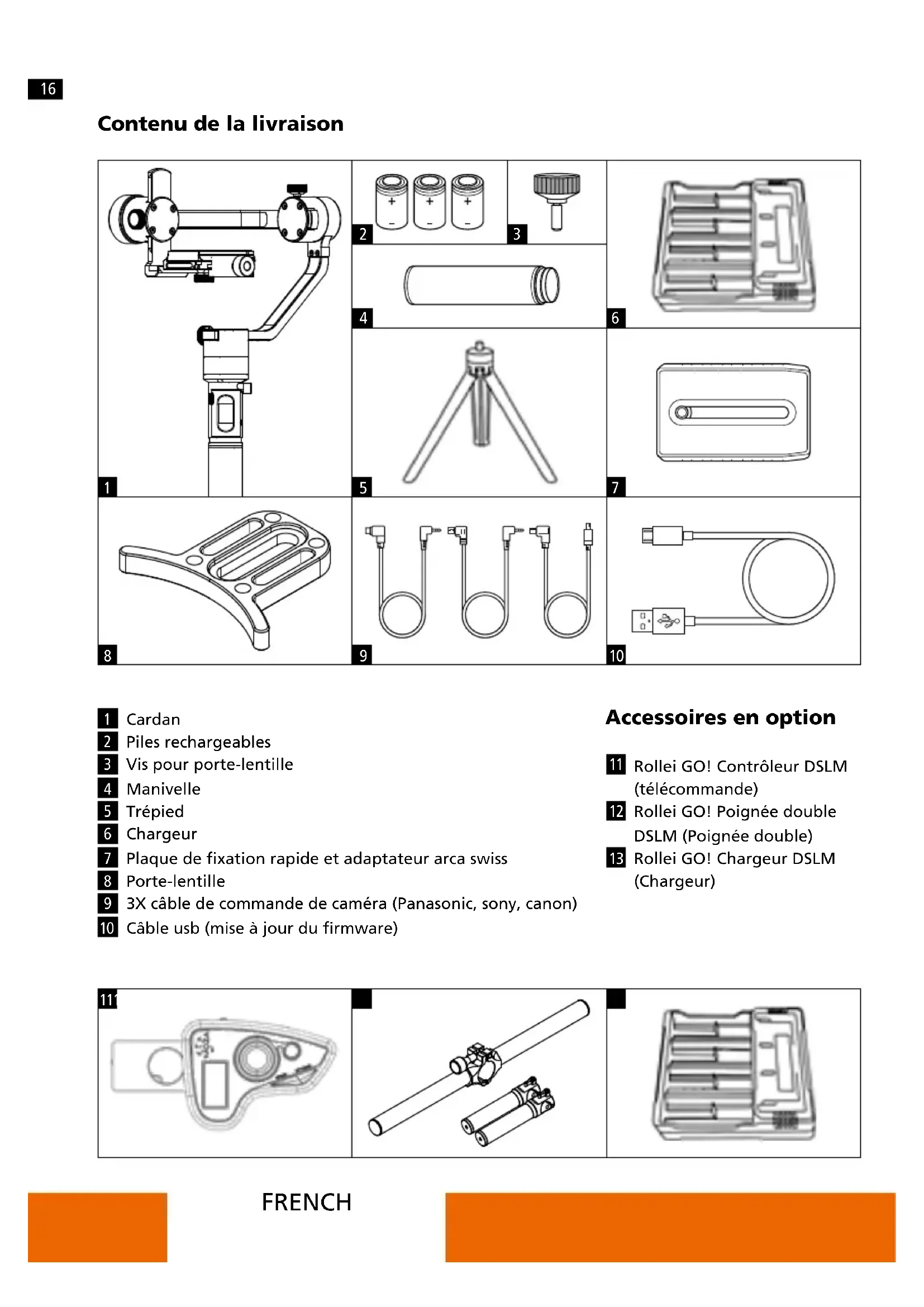 *Uniquement en liaison avec le câble de commande de caméra approprié.21 Caractéristiques techniques Rollei GO! DSLM Poids 896 g (sans batterie) Dimensions 378 x 175 x 193 mm Charge utile maximale 1800 g Plage de rotation 360° Plage de rotation du rouleau 360° Plage de vitesse en lacet 360° Tension de service 9,8–12,6 V Autonomie de la batterie 12 heures Bluetooth ®1) Bluetooth 4.0 Entrée USB Micro USB 2.0 Entrée DC 12,0 V Sortie DC 7,4 V Batterie Li-Ion ICR 26350 3,7 V 2000 mAh | 7,4 Wh Chargeur Tension d‘entrée 5,0 V DC Tension de sortie 4,2 V DC Courant de sortie 500 mA X 4 Temps de charge 4 heures La conception et les données techniques sont sujettes à modification sans préavis. 1) La marque verbale et les logos Bluetooth
